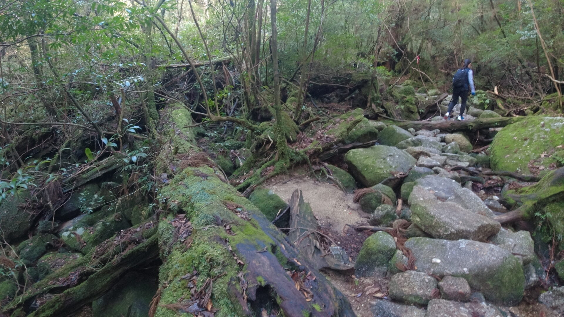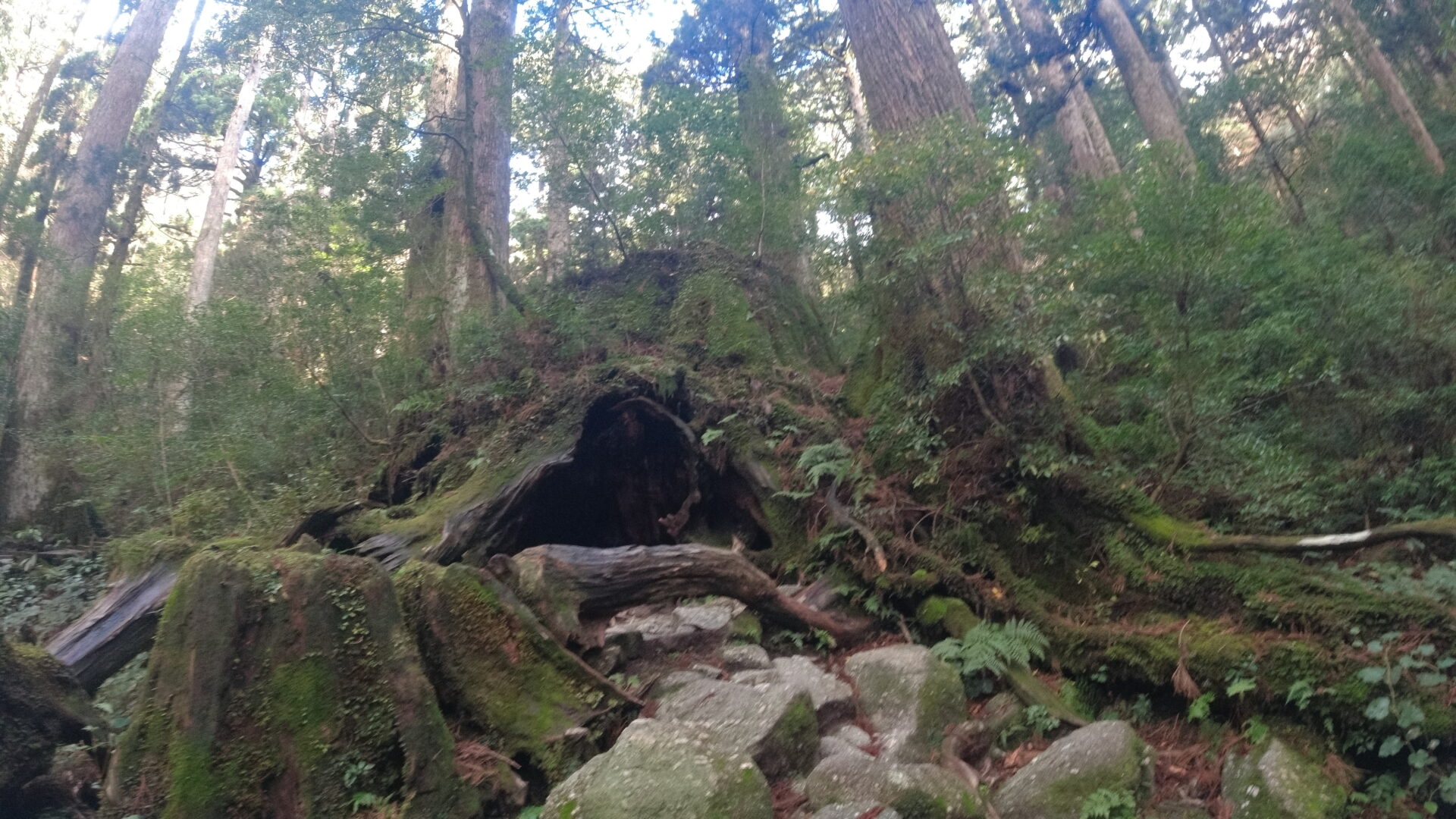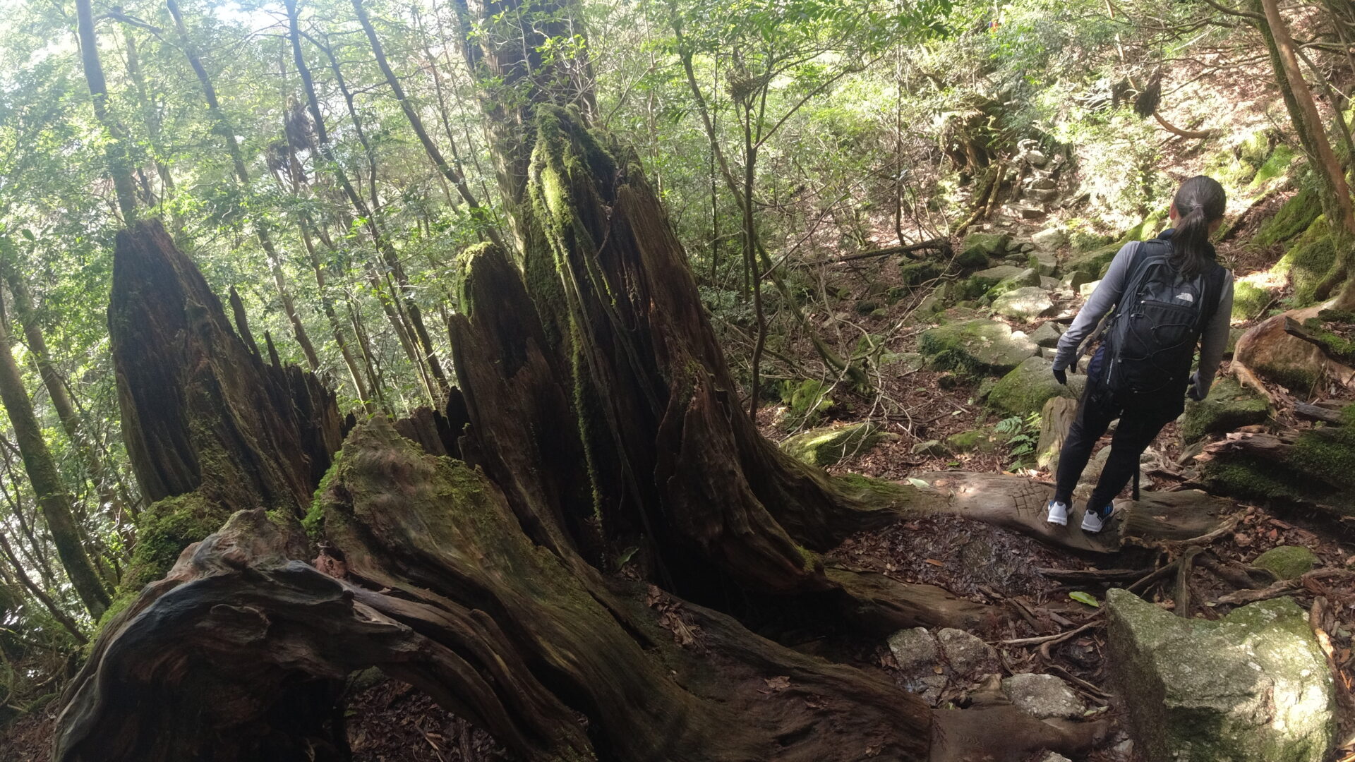 トロッコ道の終端に到達するとそこからは登山道。巨大な屋久杉がたくさん生えている森の中を進む。