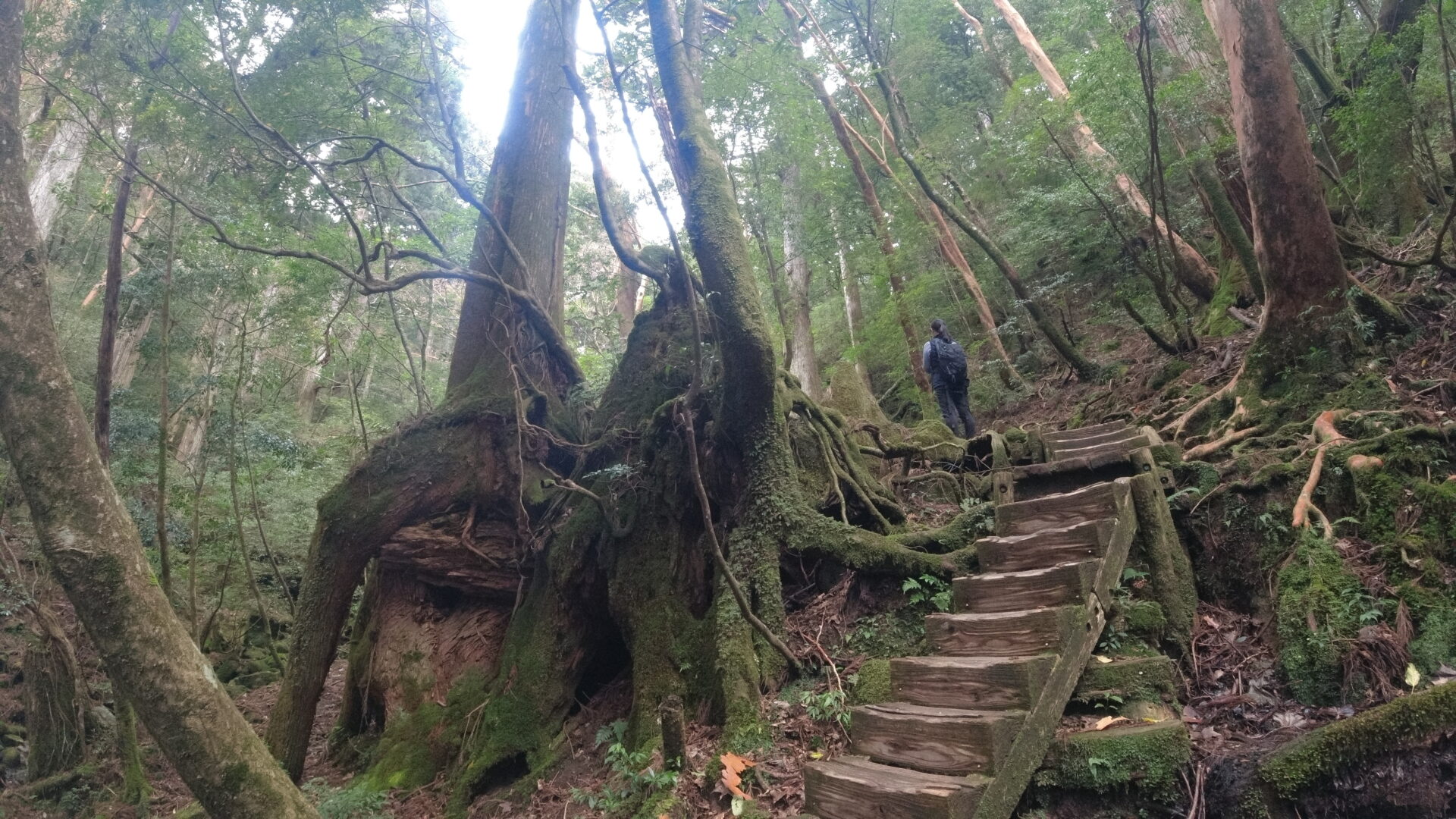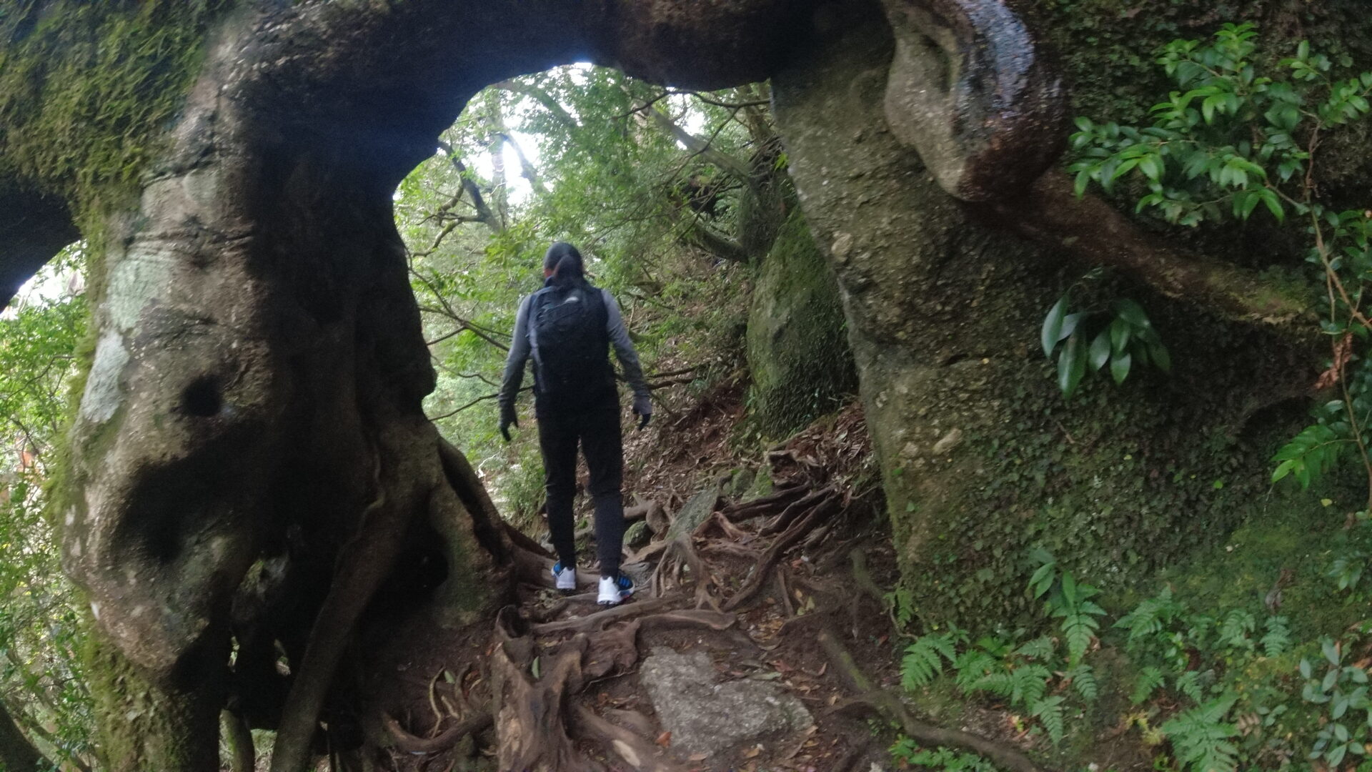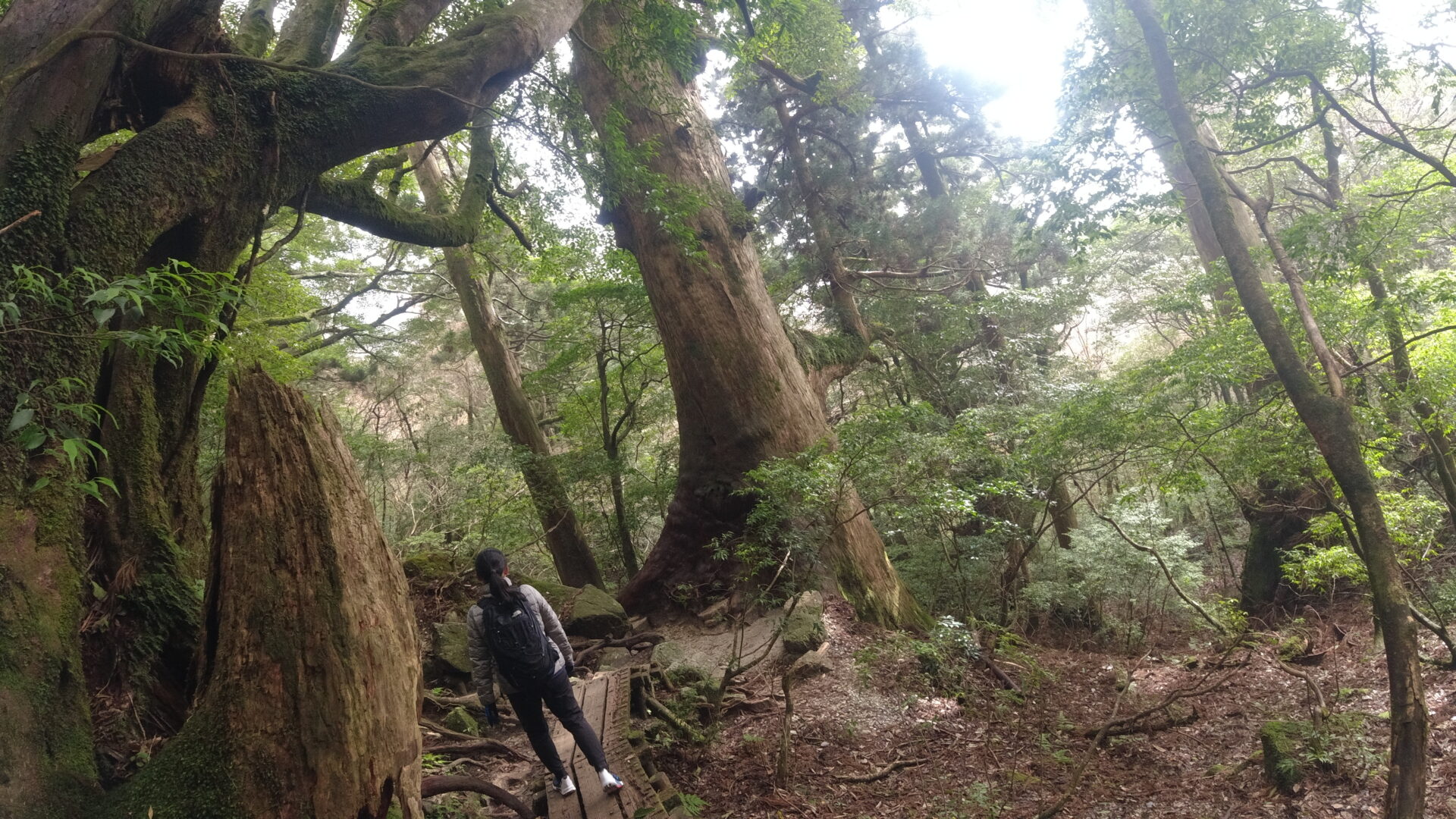 トロッコ道の終端に到達するとそこからは登山道。巨大な屋久杉がたくさん生えている森の中を進む。