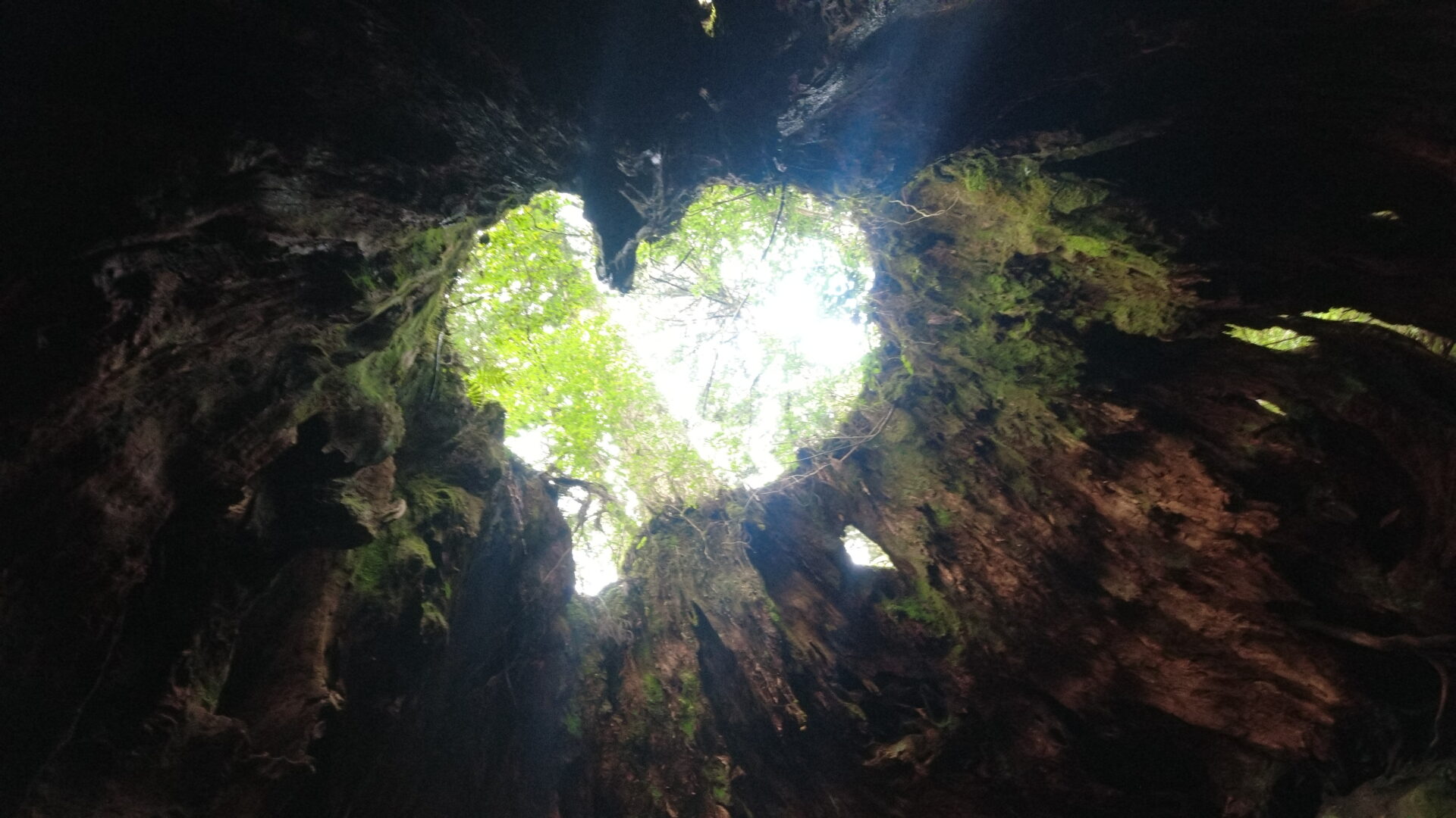 道中にあるのが「ウィルソン株」と呼ばれる巨大な木の株。400年ほど前に伐採された切り株で、中が空洞になっていて8畳ほどの広さがある。内部から見上げたときにハートマークに見える角度があってなかなかロマンティックなウィルソンである。