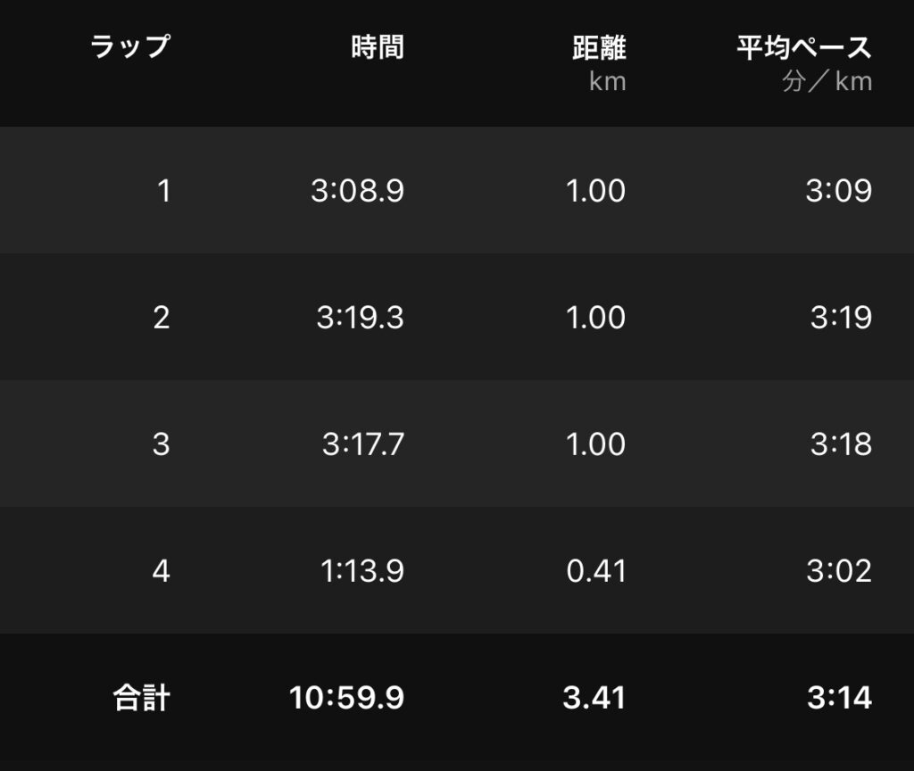 どれぐらいぶりかわからないぐらい久々に3000m(約)を走ったけど、この距離はもともと苦手なイメージがあって、5000mのスパート的な速さで押し続けなければいけないのとともに、1500mほど短くもない。