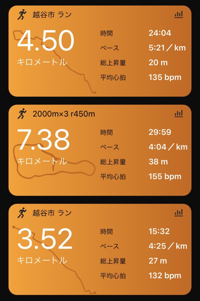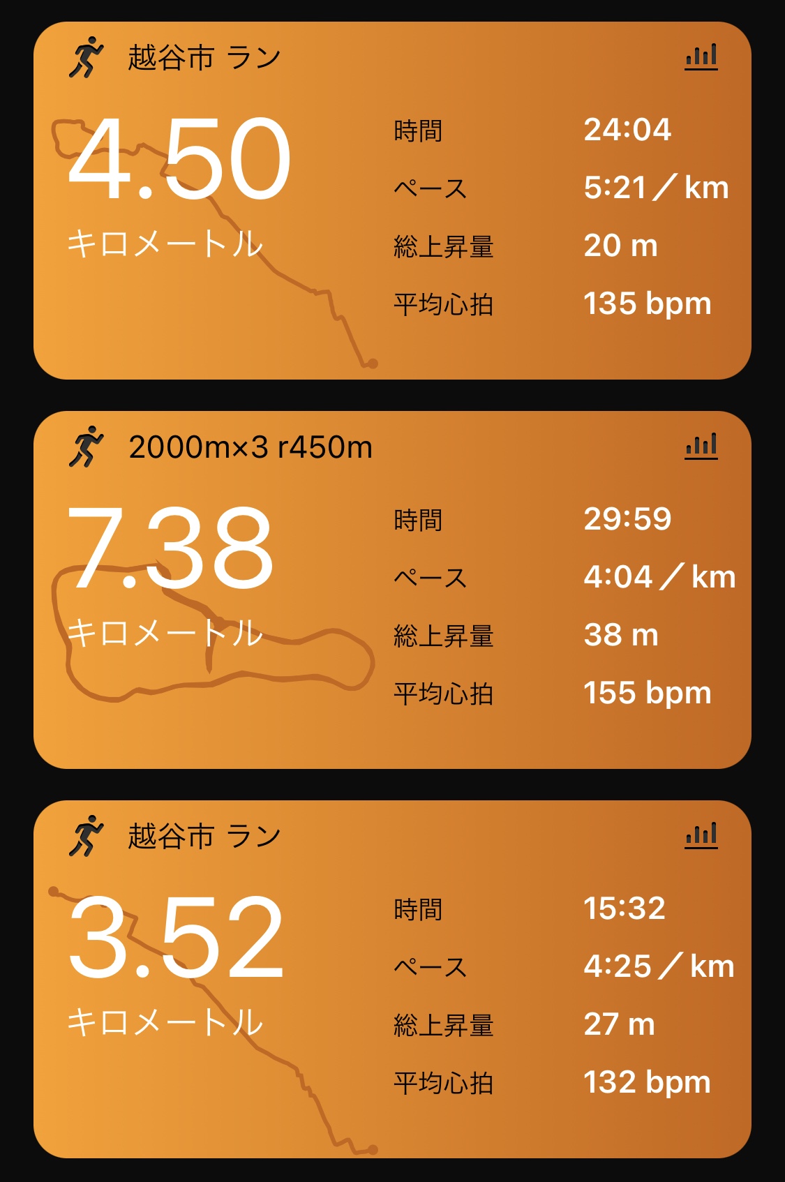 ペースの感覚的には5kmのレースペースよりも遅く、10kmのレースペースよりは速く、といった感じ。気温・風・当日の調子でかなり結果は左右されると思っていて、どれもあまり良くない状況の中ではタイムはどうでもあらかじめ決めた3本を遅くてもやるのが大事かなと思う。