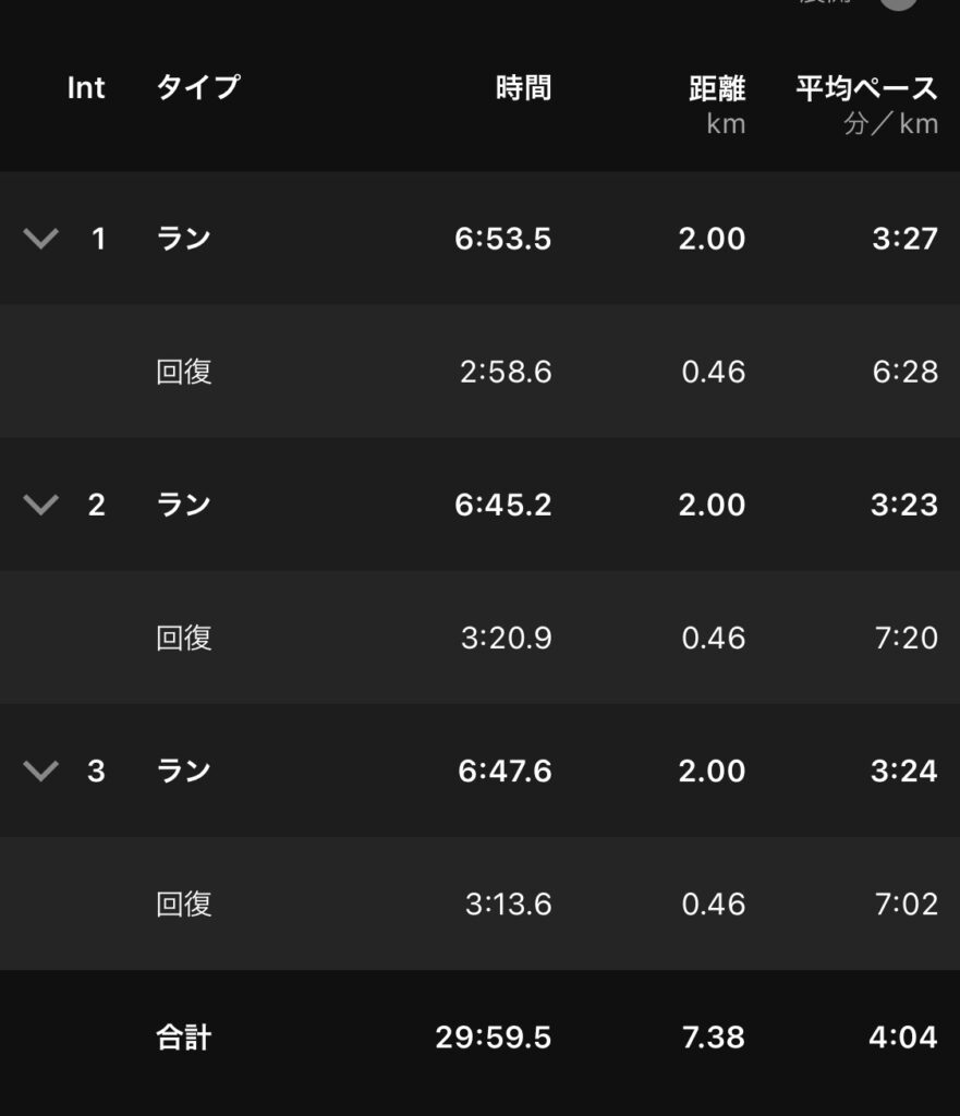 7分(3’30/km)超えてもいいや(その分疾走時間増えてトレーニング効果が+++)と自らを甘やかしながらキッチリと3本やる。