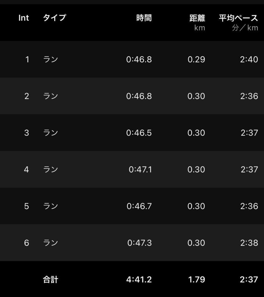 いつもはサンカケナナ(3×7)なんだけど、ちょっとペースが速すぎたみたいで7本目48”かかりそうだったので追い込みすぎないようにサンカケロクでやめ。