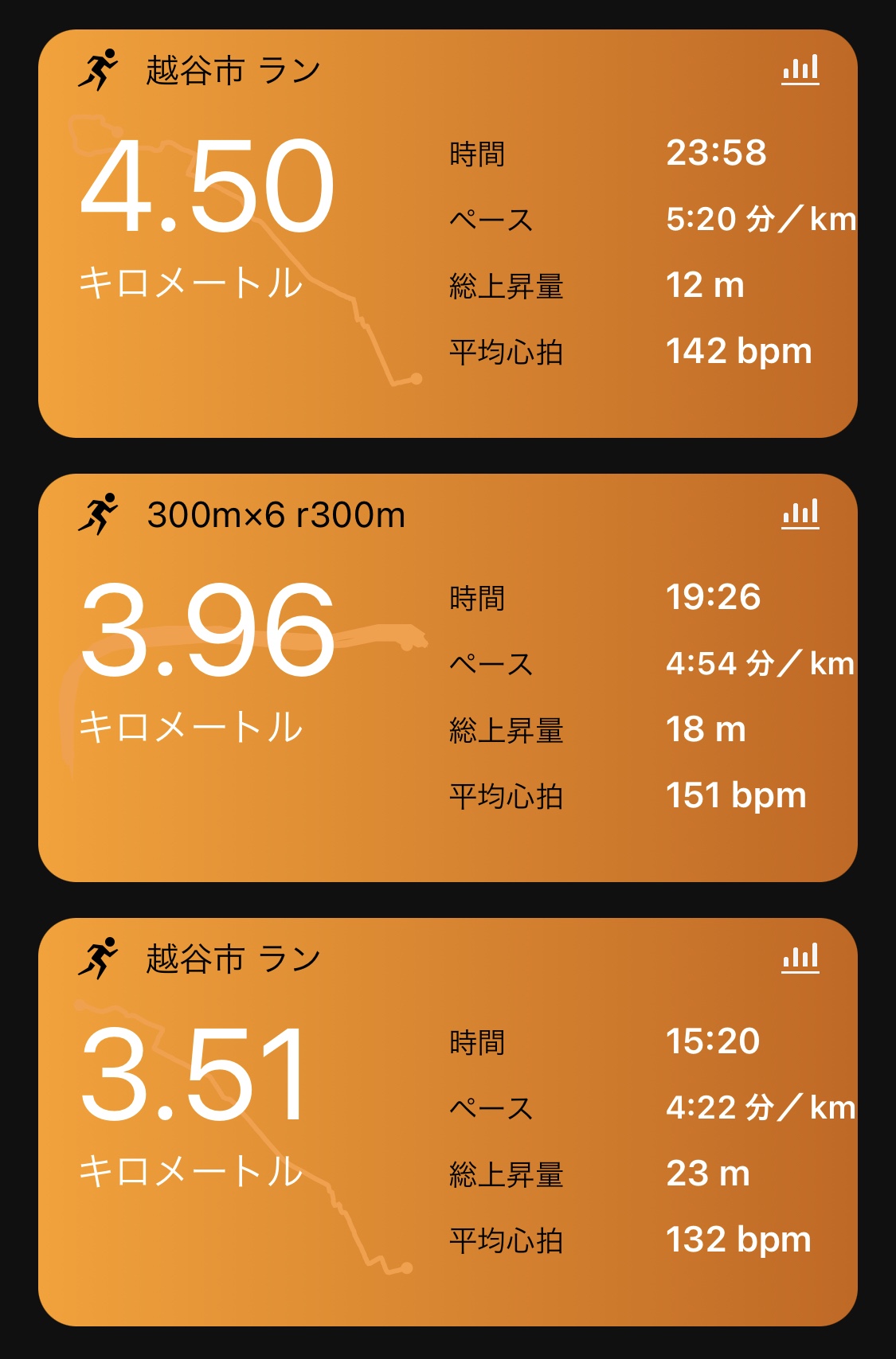 いつもはサンカケナナ(3×7)なんだけど、ちょっとペースが速すぎたみたいで7本目48”かかりそうだったので追い込みすぎないようにサンカケロクでやめ。