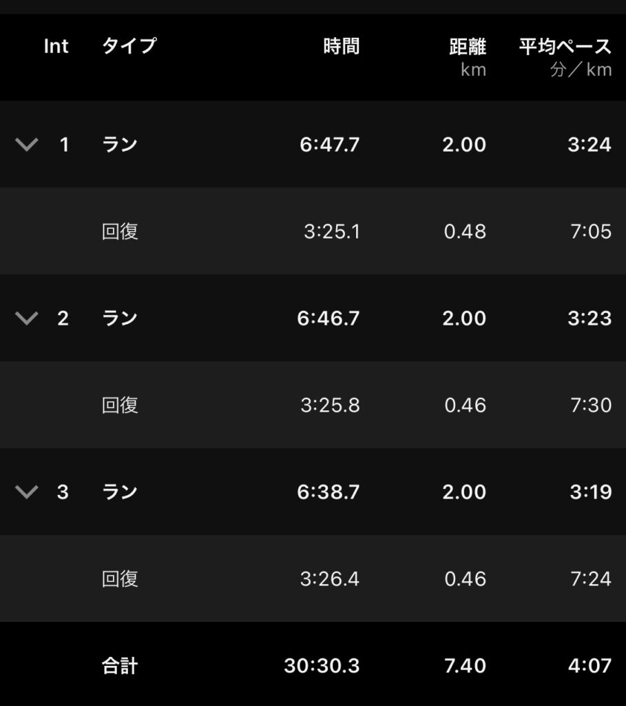 jogはできるけど3’20〜3’30/kmあたりのペースがとにかく弱くて1000mを越えると滅びるというのがここ最近の傾向である。