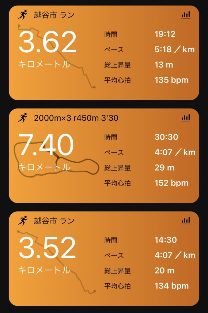 前回は6日前にやったけど2本+1000mでDNF。1本目の入りの1000mが3’17だったのでまさに自爆。やりきれるペースで適切な負荷を得たい。