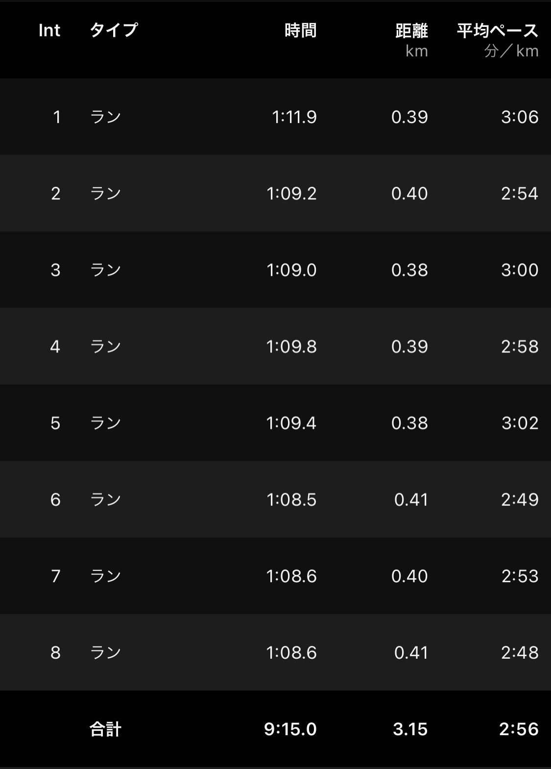 なんだかなーという感じではあるが、無理しない、無駄に追い込まない、レースペースに近いシゲキが入れられたのでヨシ!