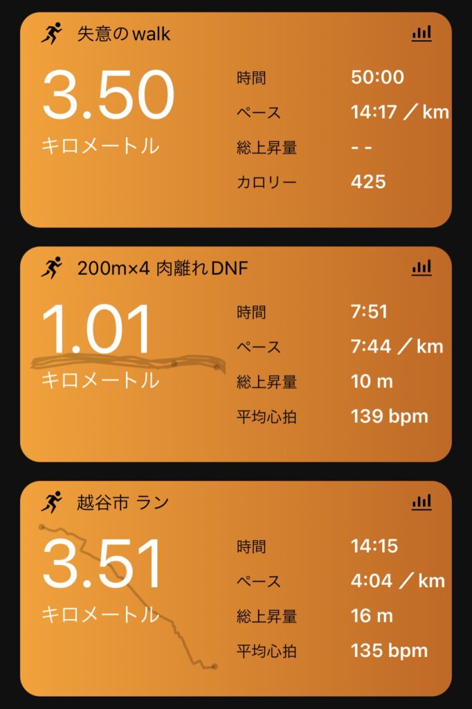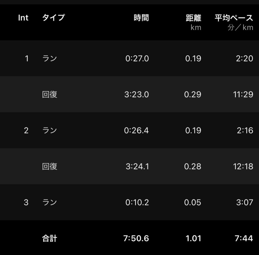 200mは初の26秒台に突入。そんなに速くなくていいと思ってたので落ち着いて4本完遂を目指して3本目を走り出した直後に