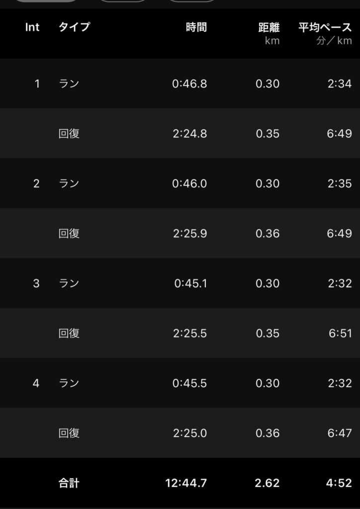 5本やろうと思えばできたけど、脚が固まってきている感覚があって、頑張ってタイムを維持する日じゃないなと思ったので終了。