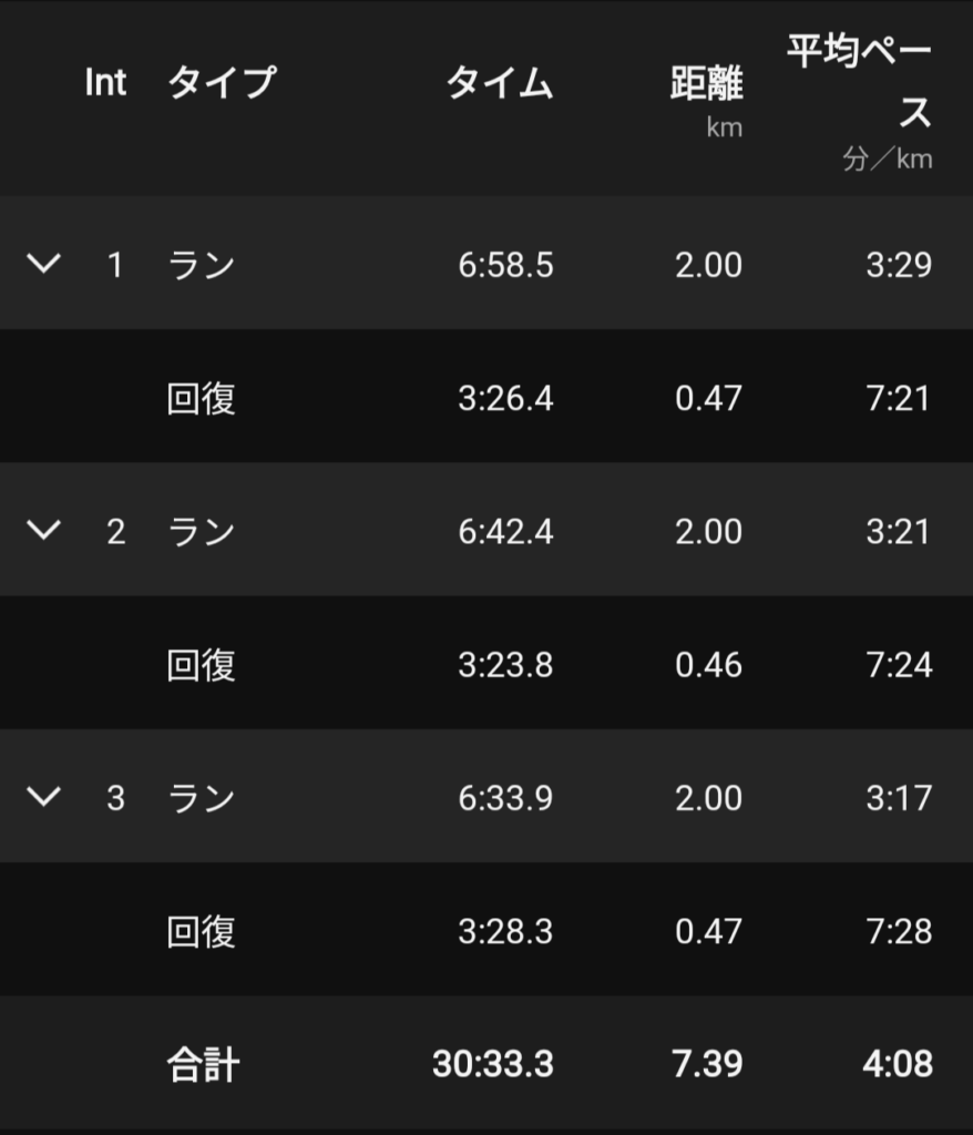 ペース感覚がわからず1本目はだいぶサボったような感じになったが、3本目のタイムはたぶんこの2000mインターバルを始めてから最速だと思われる。更にラストも出し切らず余裕は残っていたので感覚としてはかなり良い感じで終えられた。