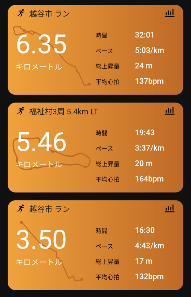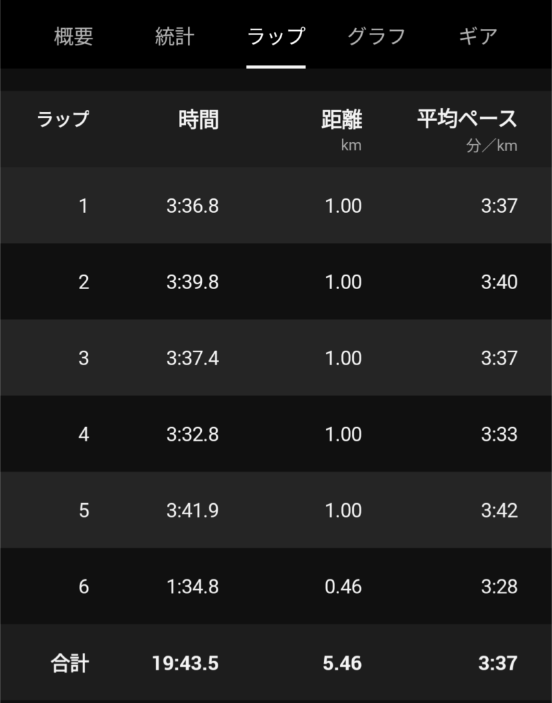 前回が3’38/kmなので、アベレージが1秒上がったことをポジティブにとらえつつも5km前後の距離が走れるようになるにはそこそこ時間がかかりそうな感じ。