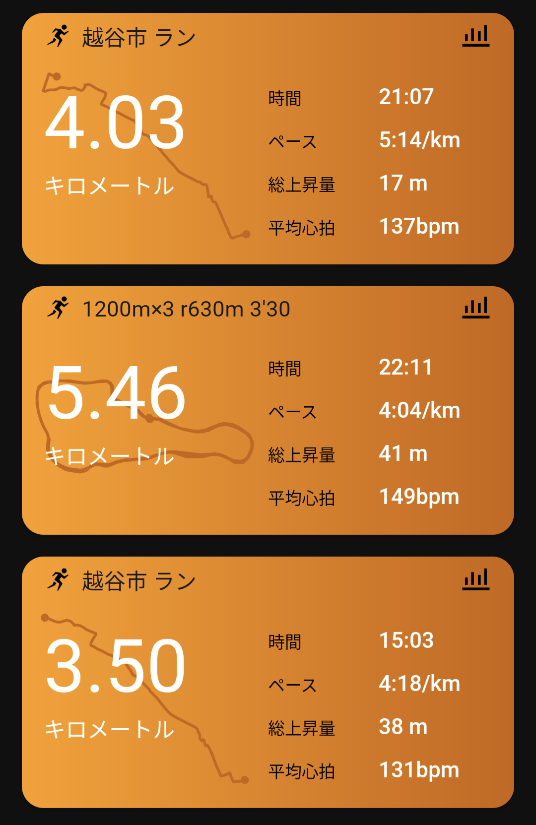 ラスト1本の400mラップが77″ – 73″ – 72″。気持ち的にはラスト400mは70を切るつもりでやったけど思いの外上がらずキレが無かった。