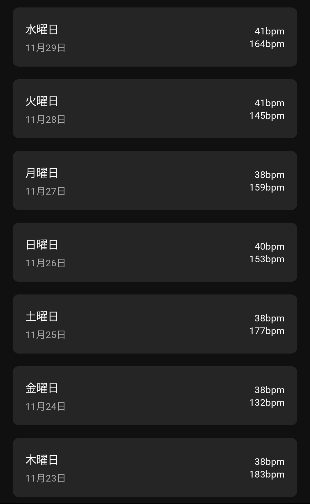 安静時心拍数を見ると日曜から少々高めの状態が続いている。絶対そうだというわけではないけど、疲労は溜まっているのかもしれない。