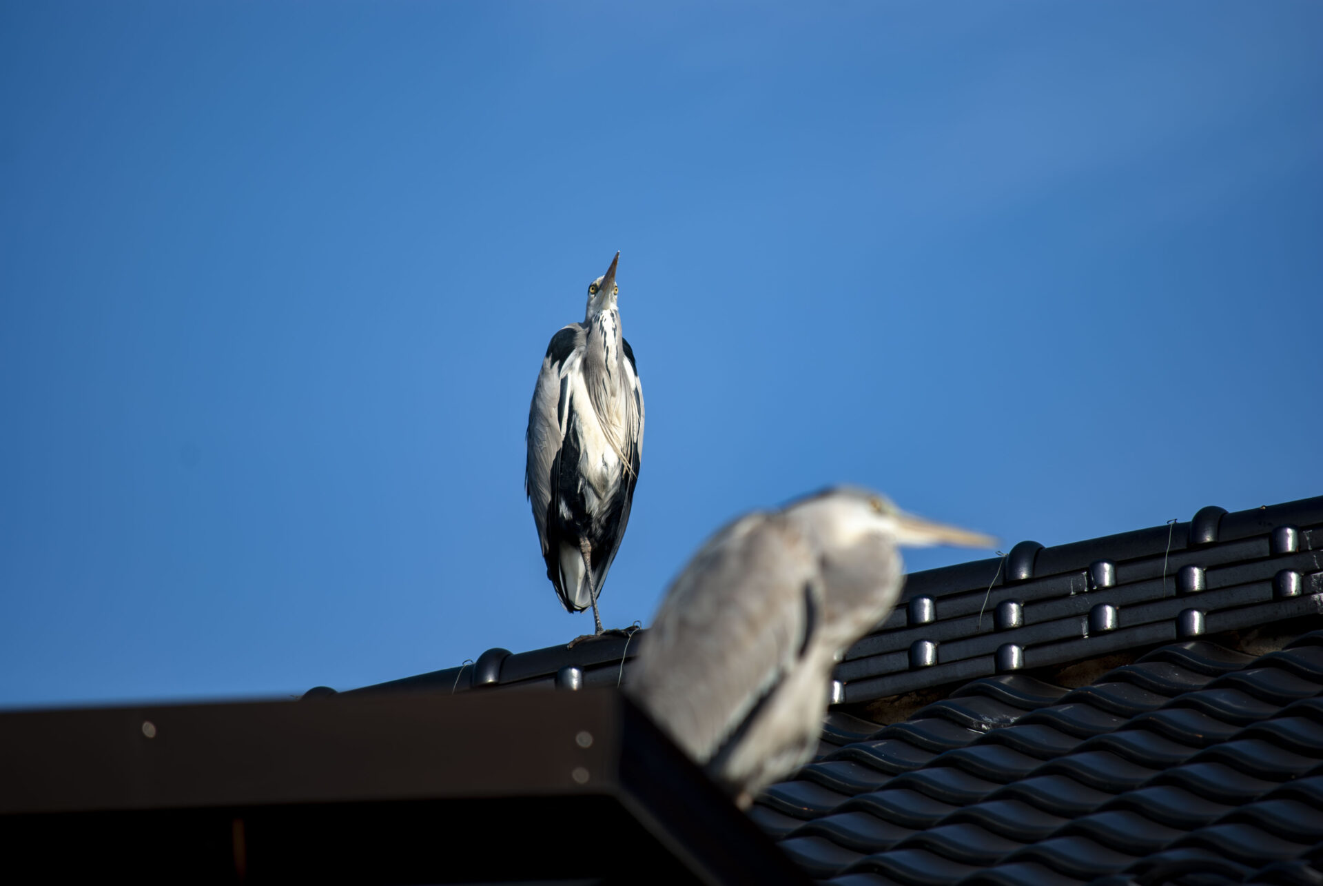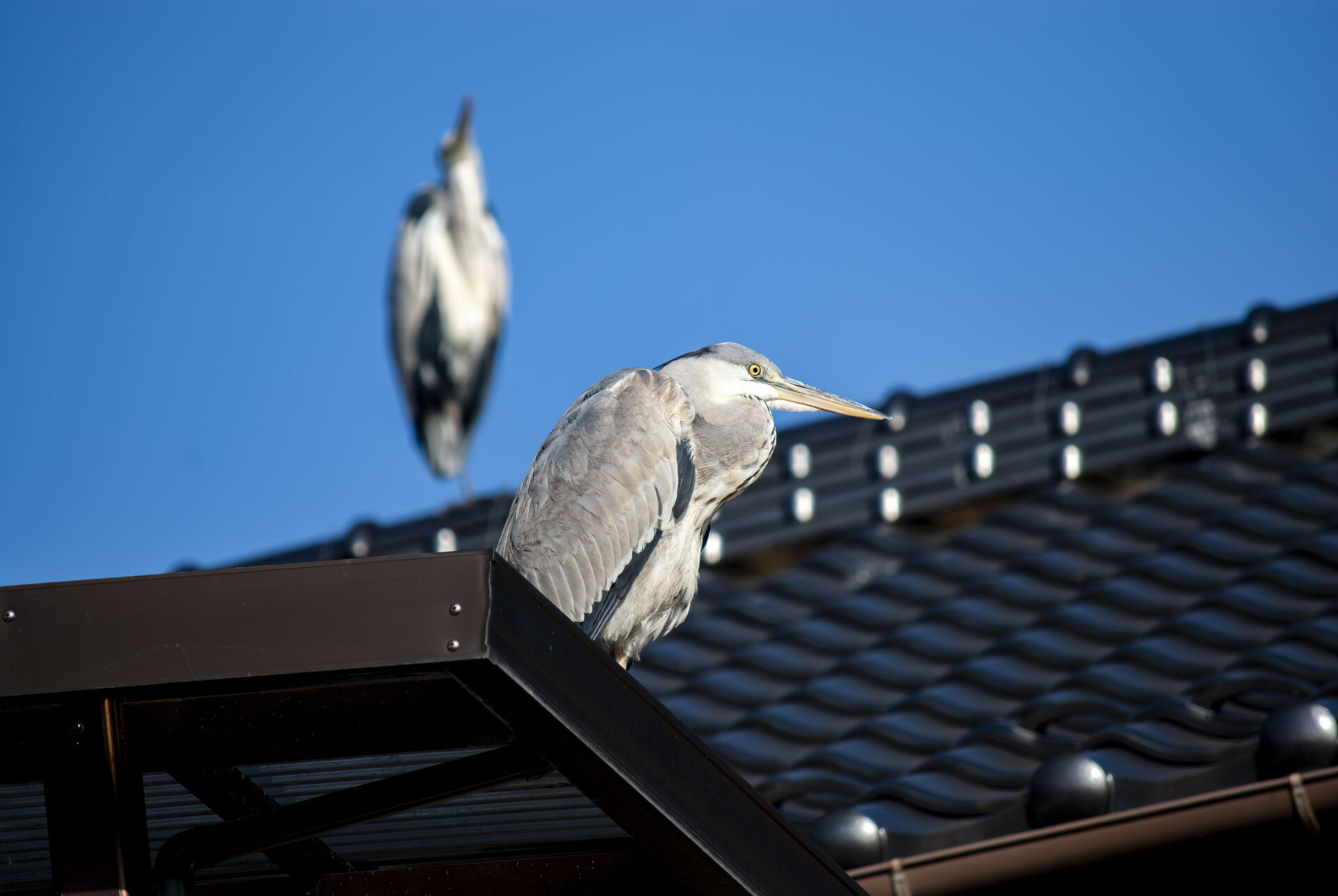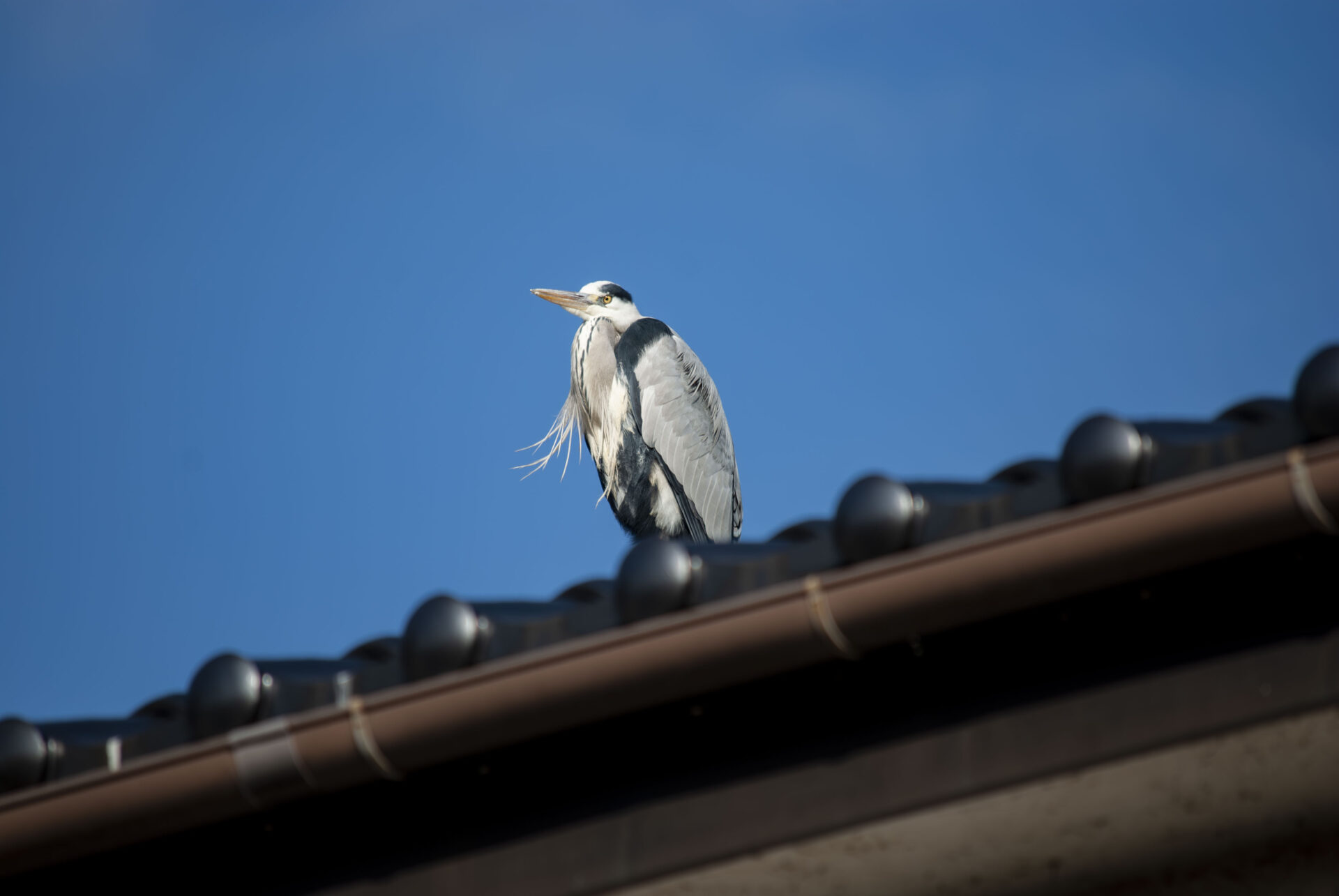 さて今日はいつもの家の屋根に3羽。手前にいるのがここ数日毎日のように会ってる若い子で、後ろに色の濃い範囲が広い子がドヤって中ボス感を出していた。