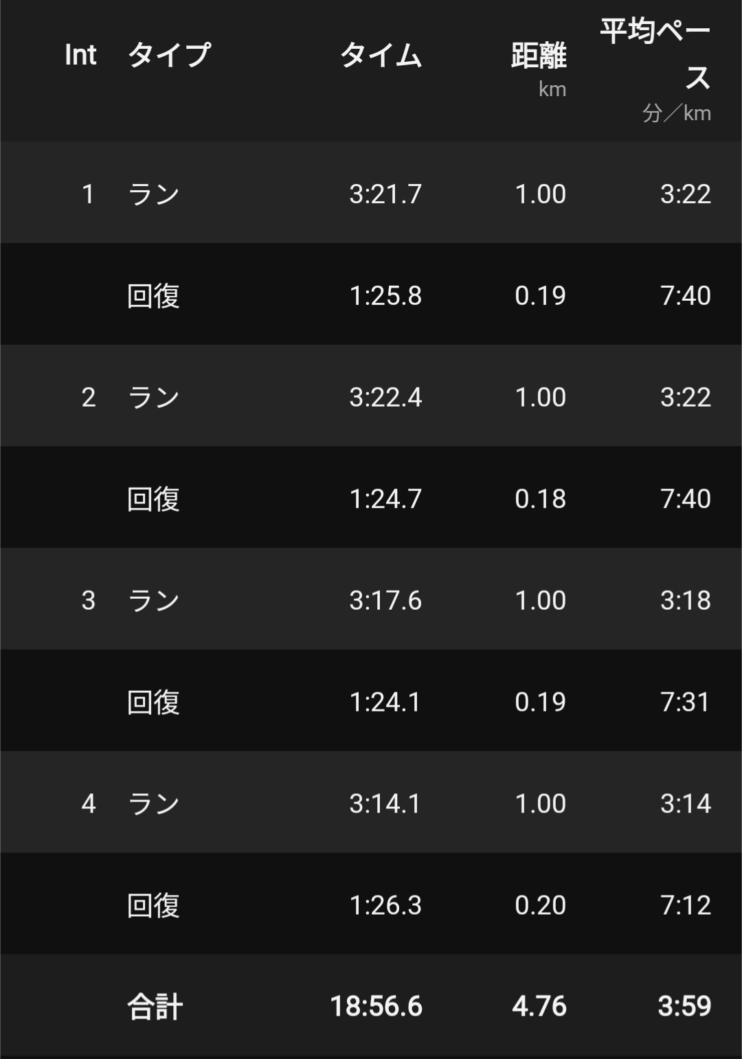ちょっとふくらはぎの負担が読めなかったので4本予定にしておいて一応無事に終了。最後は3’10切るつもりで行ったんだけど全く力及ばず。