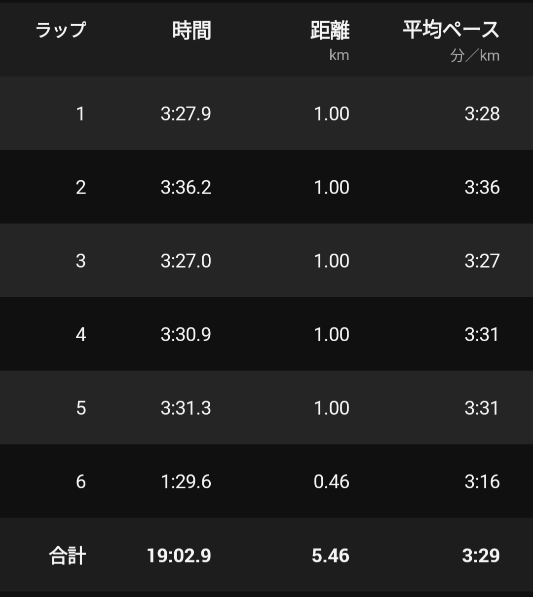 そこからやってはいけない力感マシマシの走りで3km通過を3’27に戻すも、あとはただただツラい残りの3km。だんだんとサシコミっぽい痛みも始まって3’30が全力ジリ貧みたいな感じになり、6km行けるどころかこれ5kmで終わりたくない???無理じゃない????みたいな自問自答が始まって、