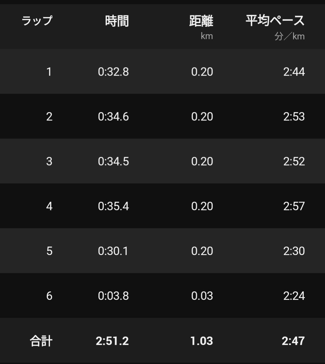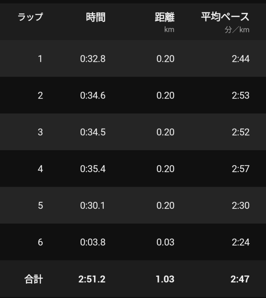 ゴール地点の印がわからなくてとりあえずGPSの200mラップで1kmになったところで止めたので正確なタイムわからんけどまあ2’50前後でしょう。1着なので細かいことはヨシ!