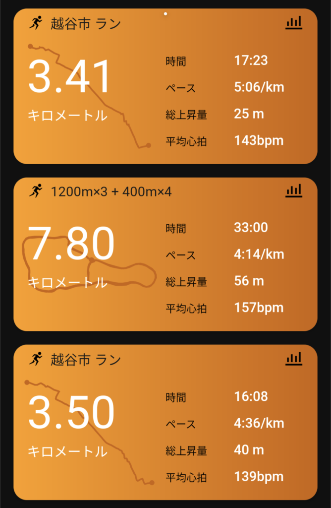 日によってGPSの機嫌が悪かったりすると数十m余計に走らされたりするわけだけど、まあレース本番じゃないし、ゴール地点をある程度曖昧にしておいたほうが「ゴールですぐ止まらずちゃんと走り抜ける」みたいな感覚が身についてそれはそれで良いんじゃないかなと思ったり。