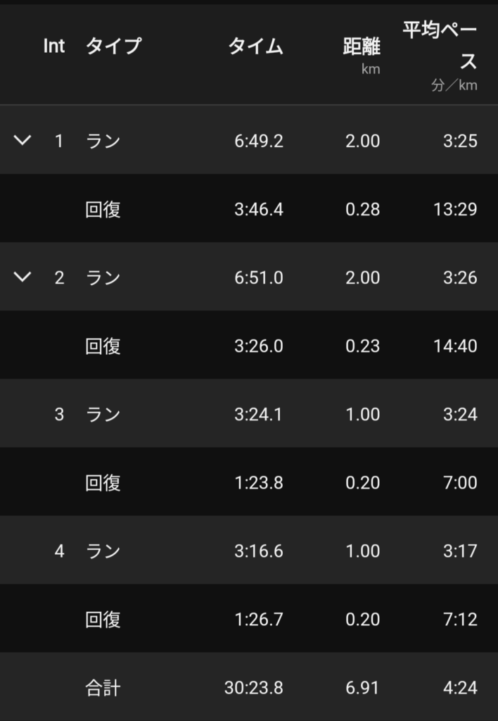 んで3本目を1000mでDNF。仮に残りの1000mを走ったら3’30は間違いなく超えるだろうなというような感覚だった。