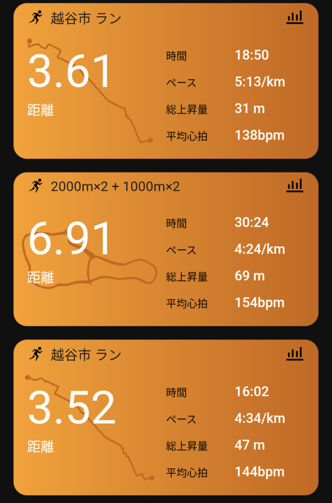 そもそもの設定ペースは3本とも3’30/kmにして、余裕を持たせて終わった方が良かったのでは、と思った。前モモが疲労してある線を超えると急激に失速してしまうので、その線を超えないように走る。