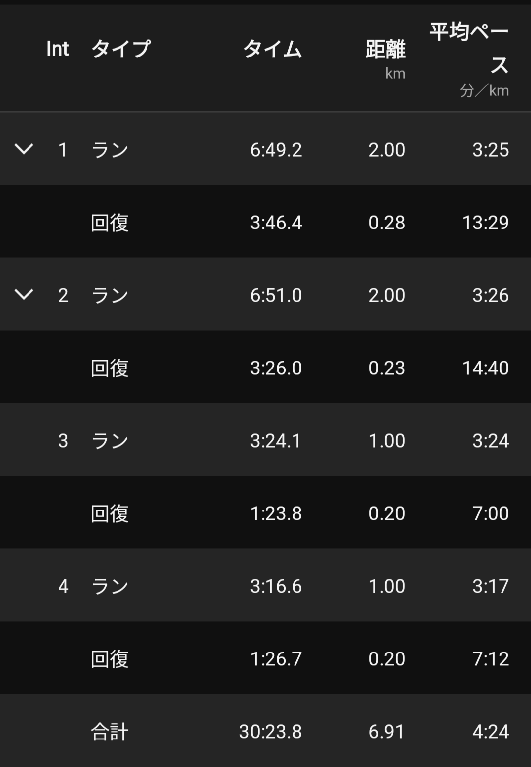 んで3本目を1000mでDNF。仮に残りの1000mを走ったら3’30は間違いなく超えるだろうなというような感覚だった。