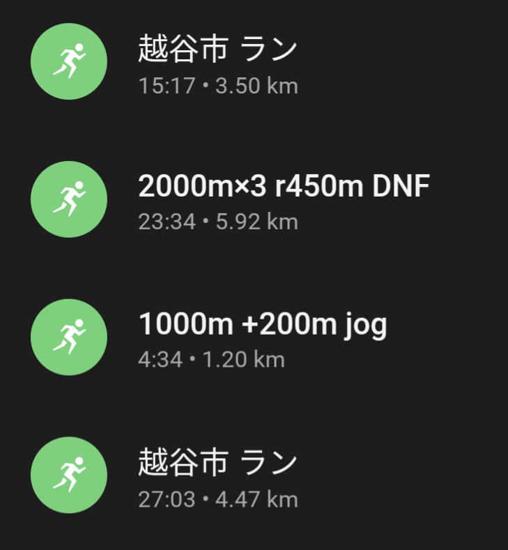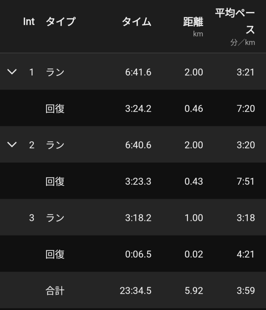 で、3本目は2本目までで普通に力を使い果たしてて後半1kmが3’30ぐらいかかりそうだなと思ったので止めてしまったw