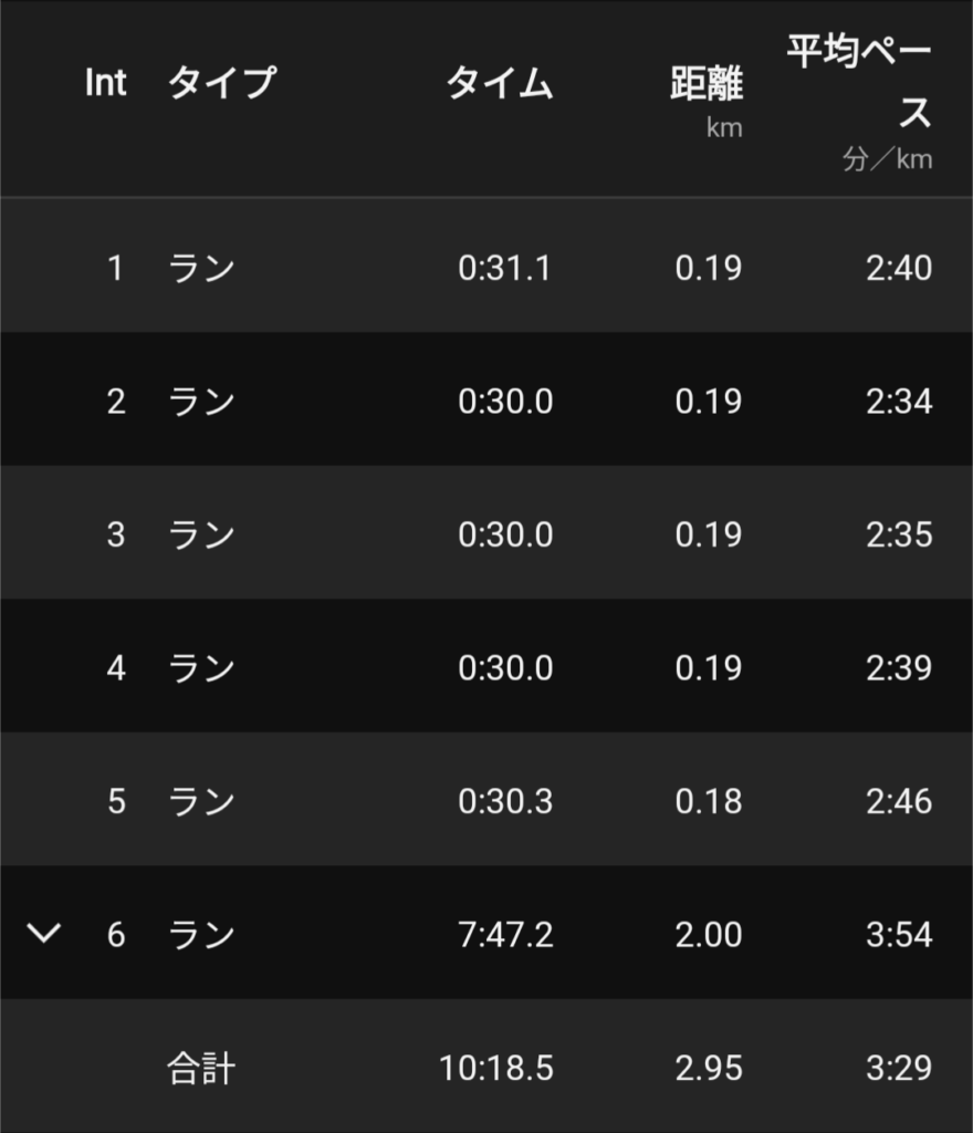 数日前に2kmが6’34で走れたので今日は短いのやってみたら200mも30″でいける。