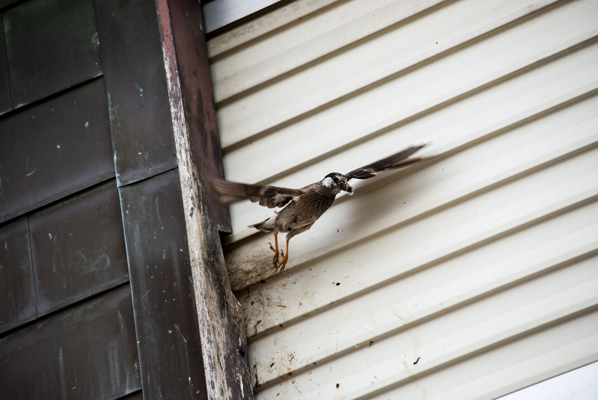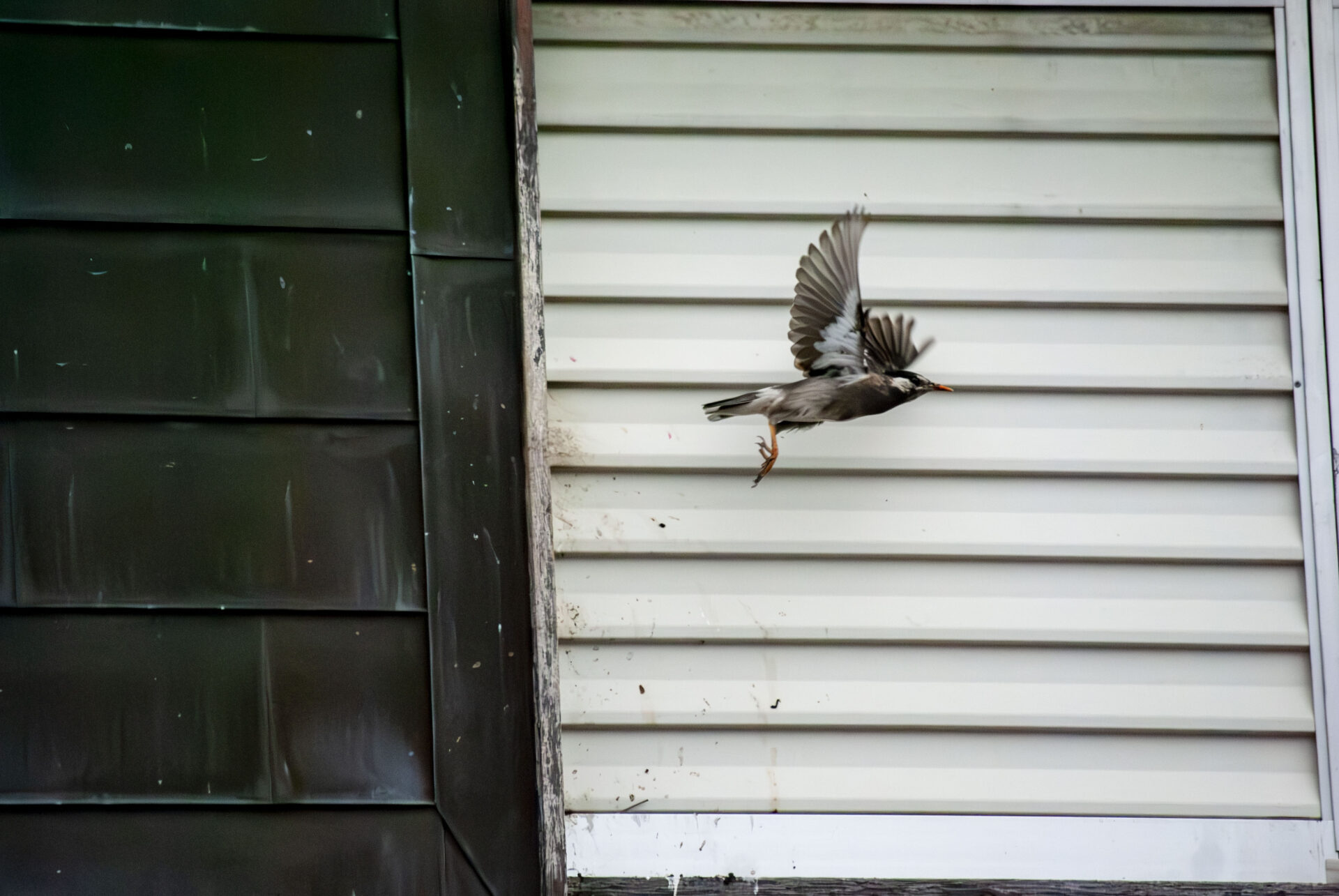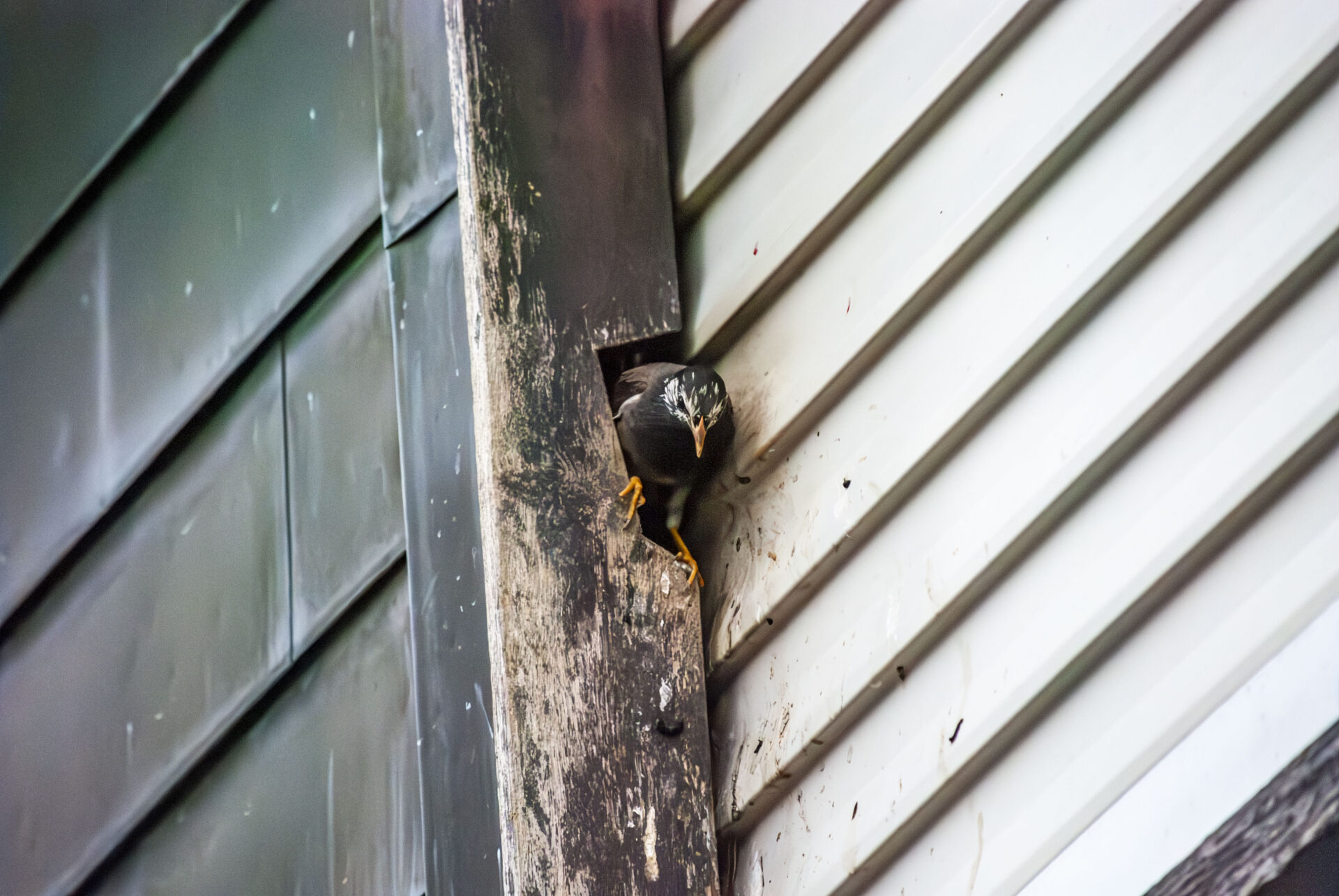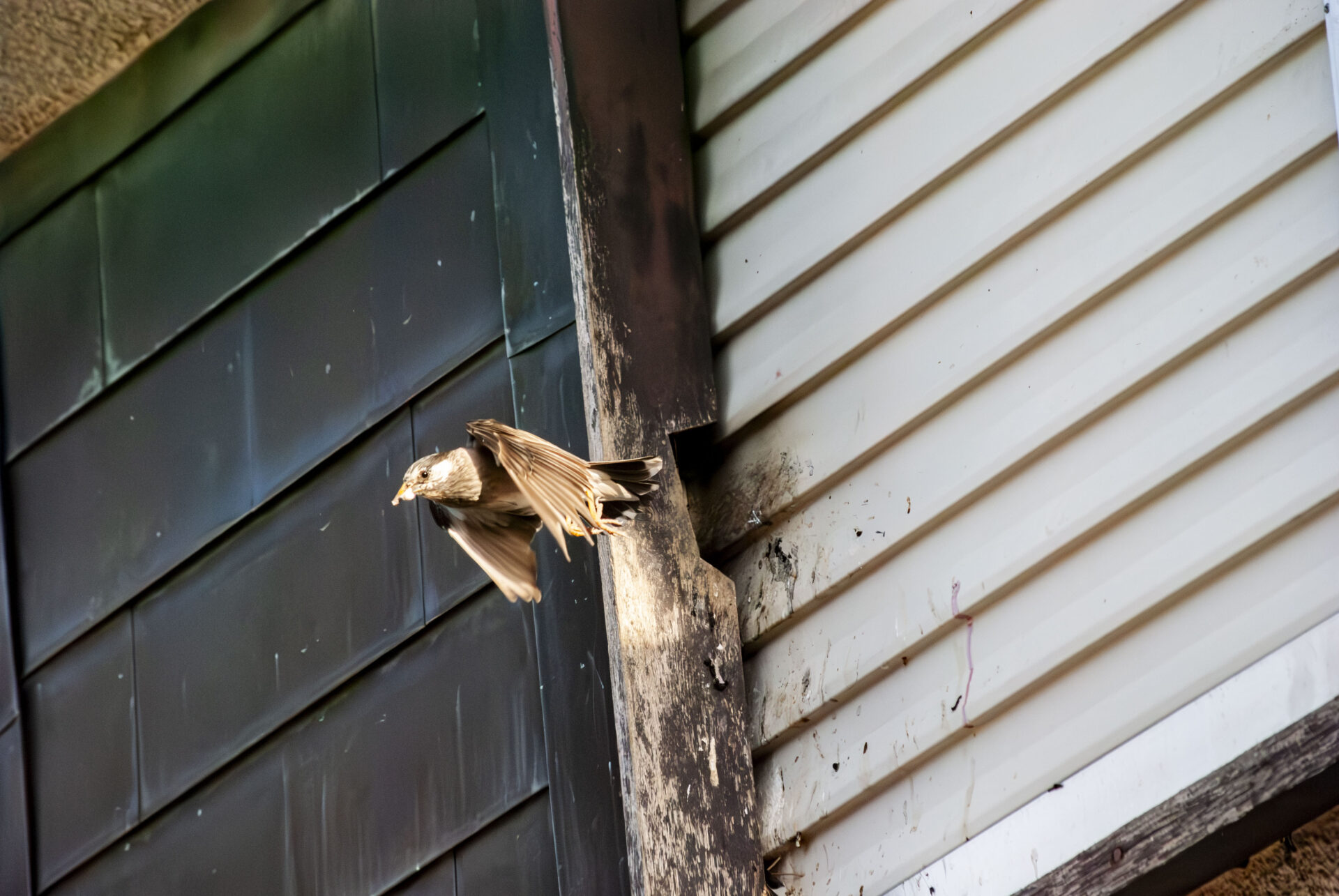 我が家のナナメ向かいのお家。雨戸の戸袋がムクドリの巣として利用されているのは去年気づいたんだけど、今年も再利用されてた。