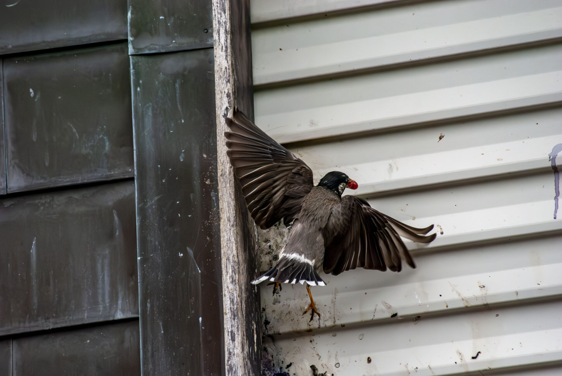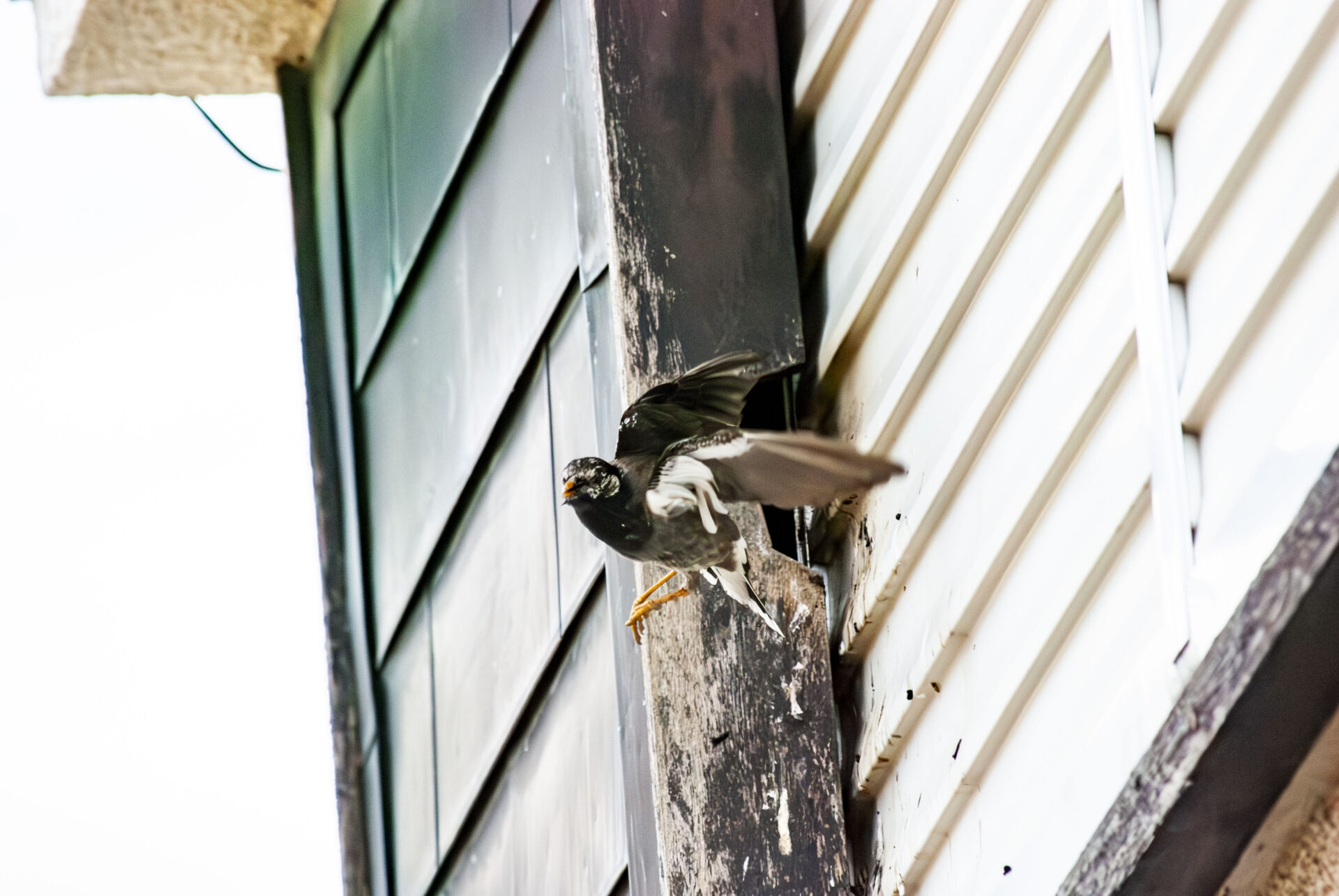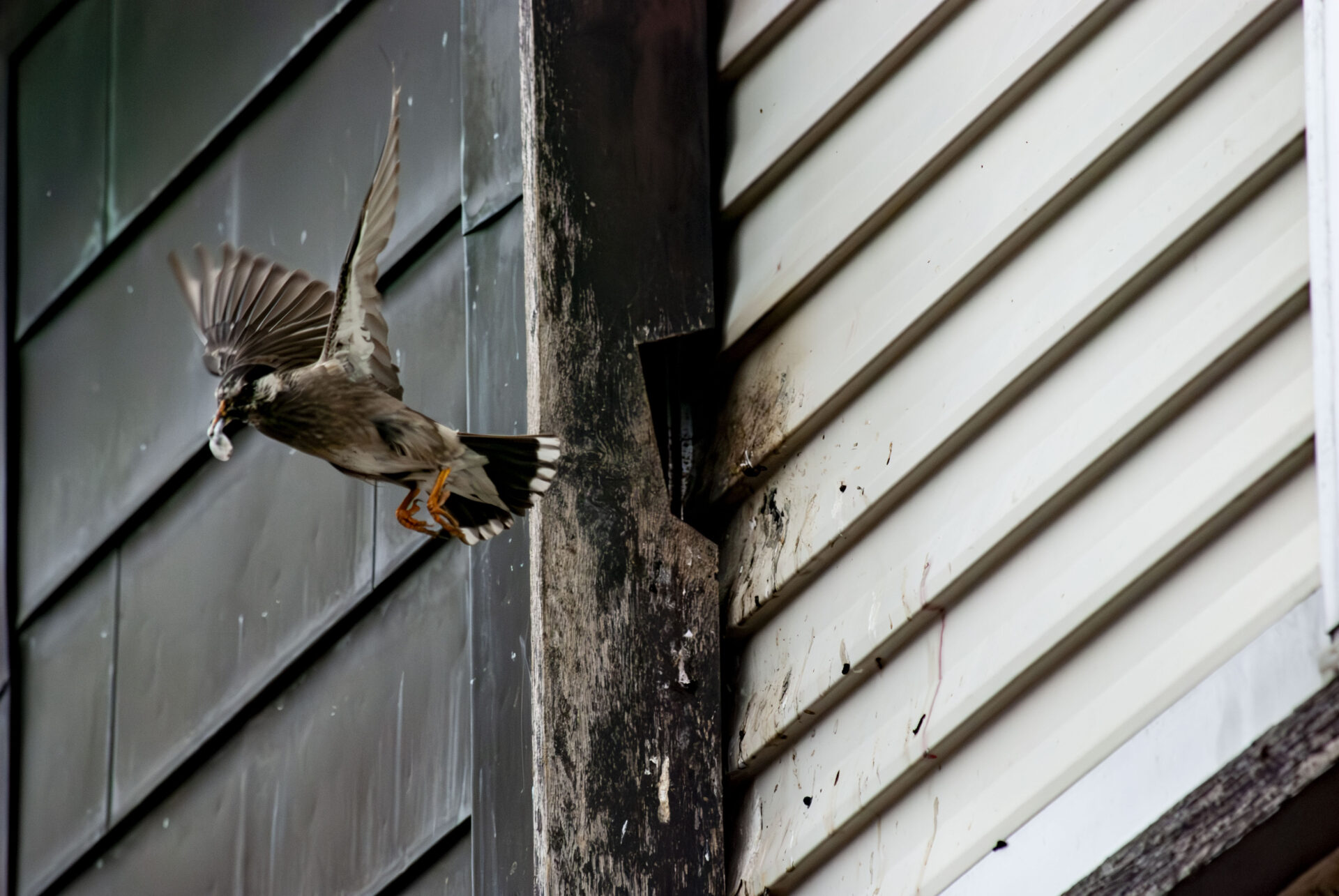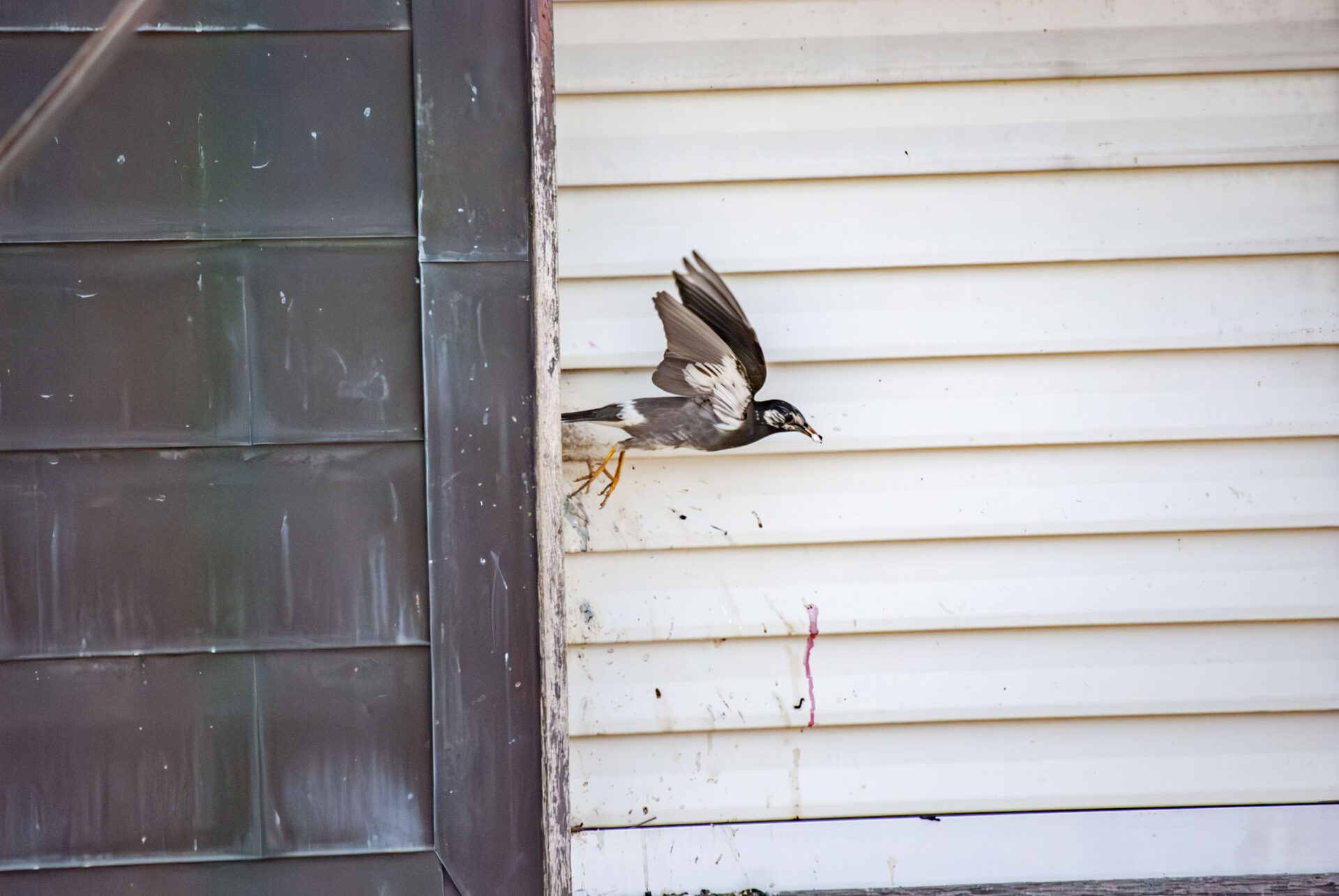 我が家のナナメ向かいのお家。雨戸の戸袋がムクドリの巣として利用されているのは去年気づいたんだけど、今年も再利用されてた。