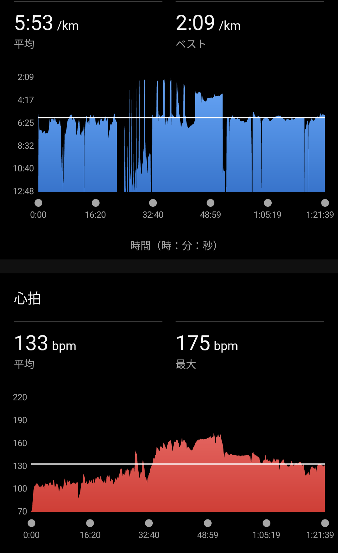 200m×5のあとの2kmが、キロ4切るぐらいのペースでも心拍が170近くまで上げて維持できるのでおトクである。