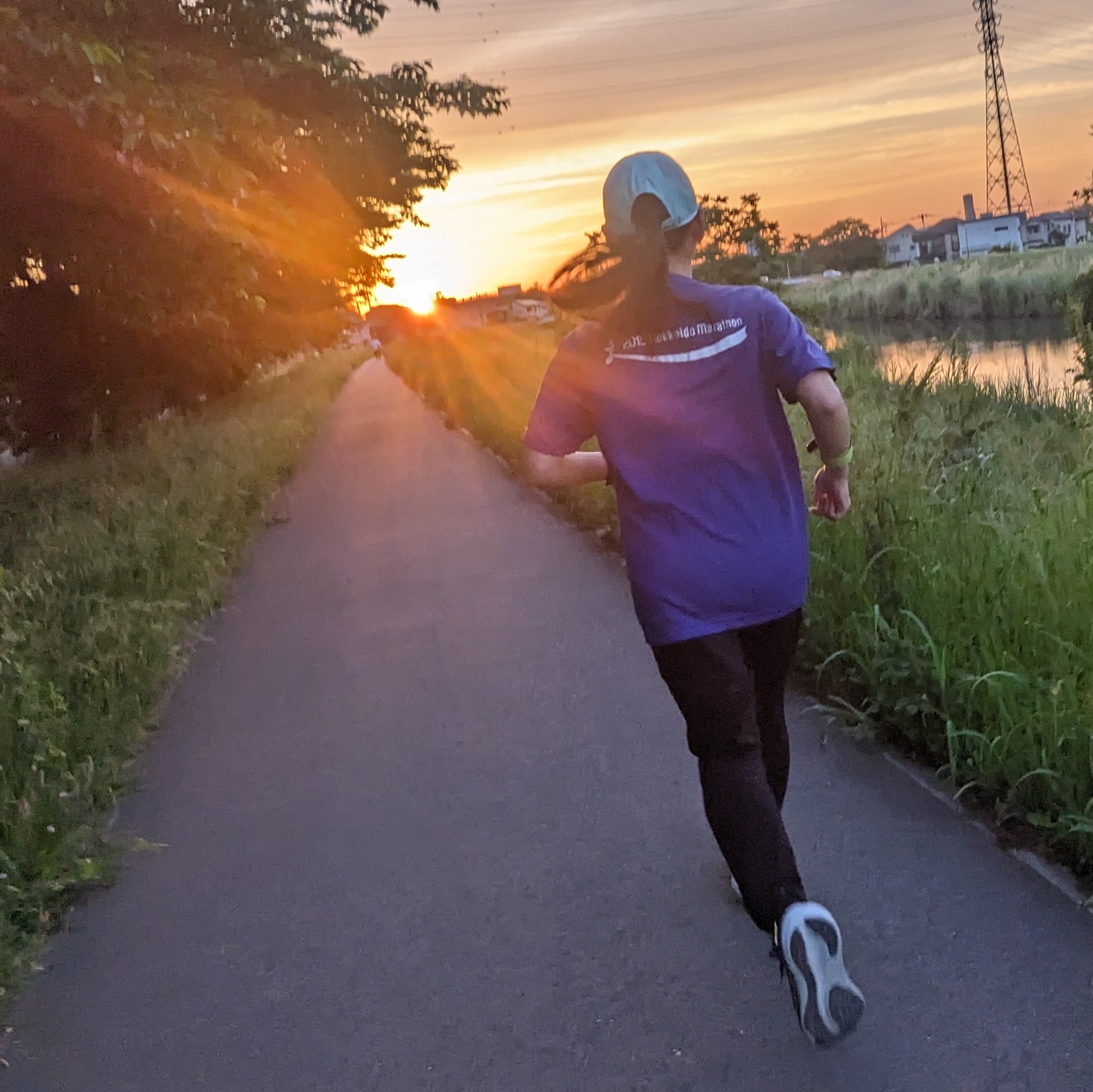 両ヒザとも皿の下が痛い!…ので、いったんレースのことを忘れるのと、嫁さんが少し走り出したので一緒にキロ6ぐらいで走ってる。