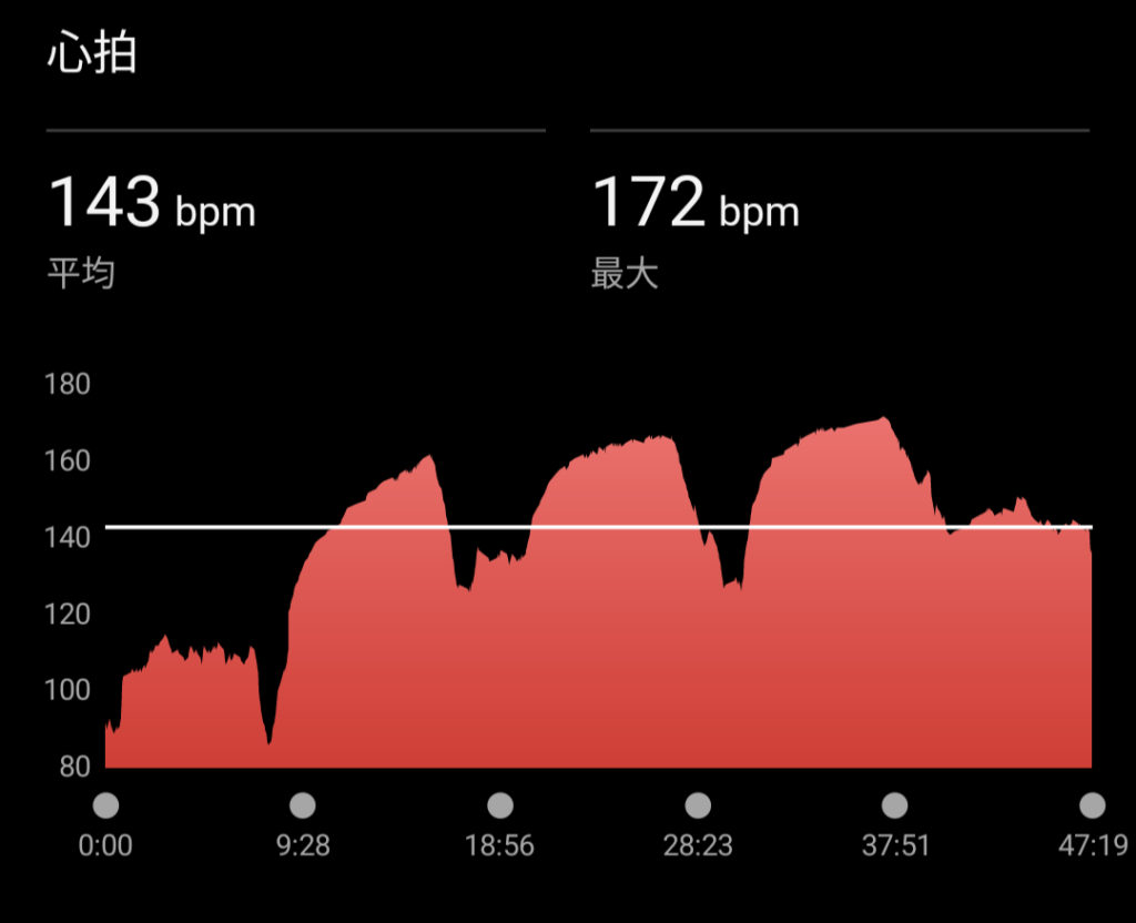 心拍160オーバーを維持することを目安にやってみてるけど、ちょっと負荷が重すぎて後半の回転数が極端に落ち気味になっちゃうのと、正直キツすぎて憂鬱になってしまうw ので今回はスピンバイクの負荷を少し下げた状態にしてみた。そのぶん回転数を上げていかないといけないんだけど、1回転あたりの負荷は低い。