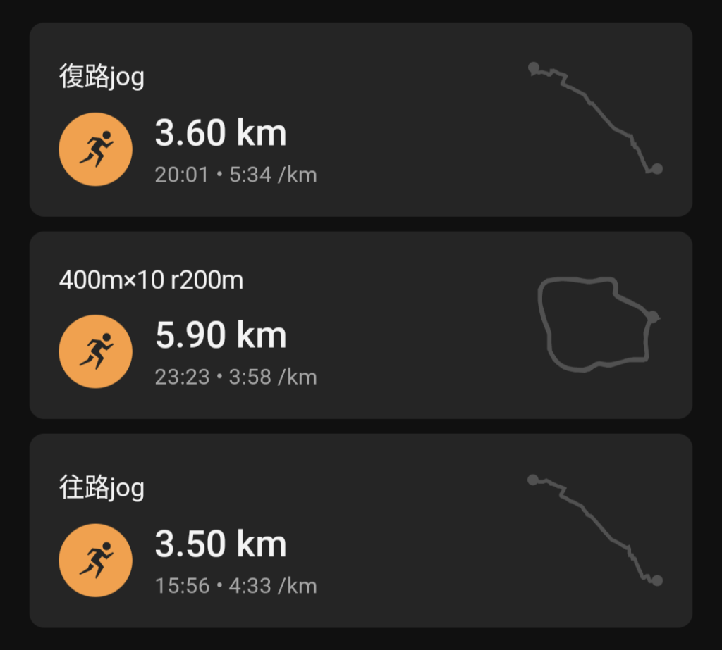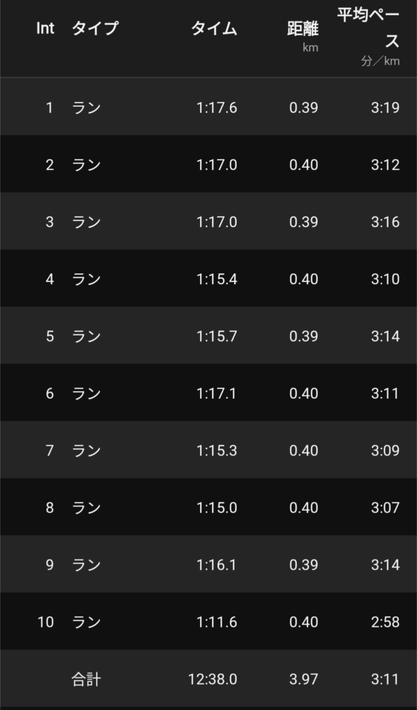 今までは疾走タイムが70″前後まで持って行ってたけど、リカバリーで80″とか90″かかってたり、そもそも10本こなせないみたいなケースがほとんどだった。