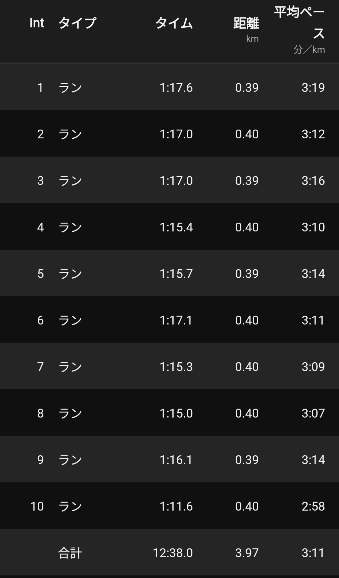 今までは疾走タイムが70″前後まで持って行ってたけど、リカバリーで80″とか90″かかってたり、そもそも10本こなせないみたいなケースがほとんどだった。