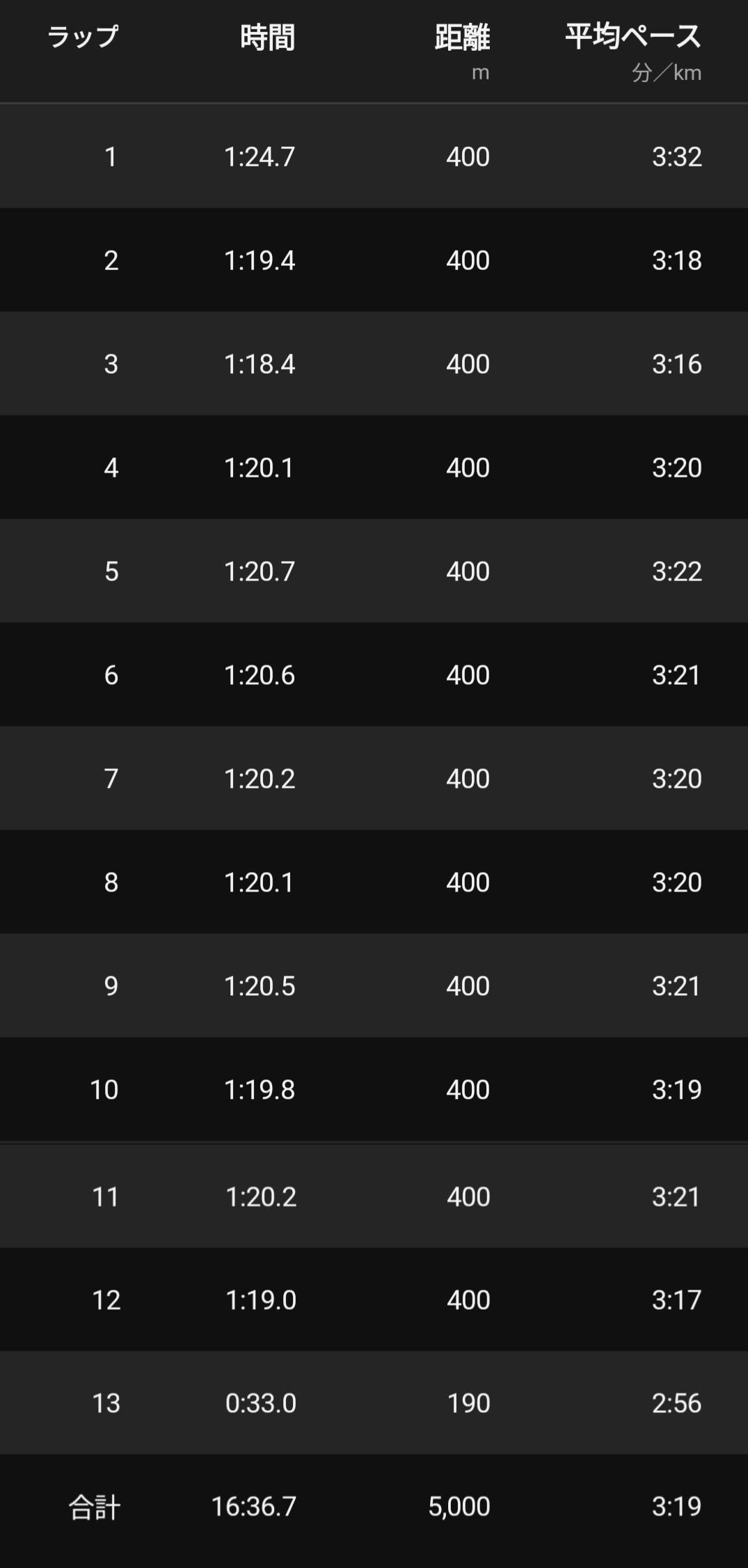 実際は16’40のペースで進んでいたようで、後半は風も強くなってきてラスト4周から余裕ゼロ。最後までペーサーに着いていたのは3人で、ラスト200mからどうにか抜け出してゴールした。スパートのキレも主観としてはイマイチではあったけど、ラップを振り返ると5000mの配分としてはとても良いのではと思う。