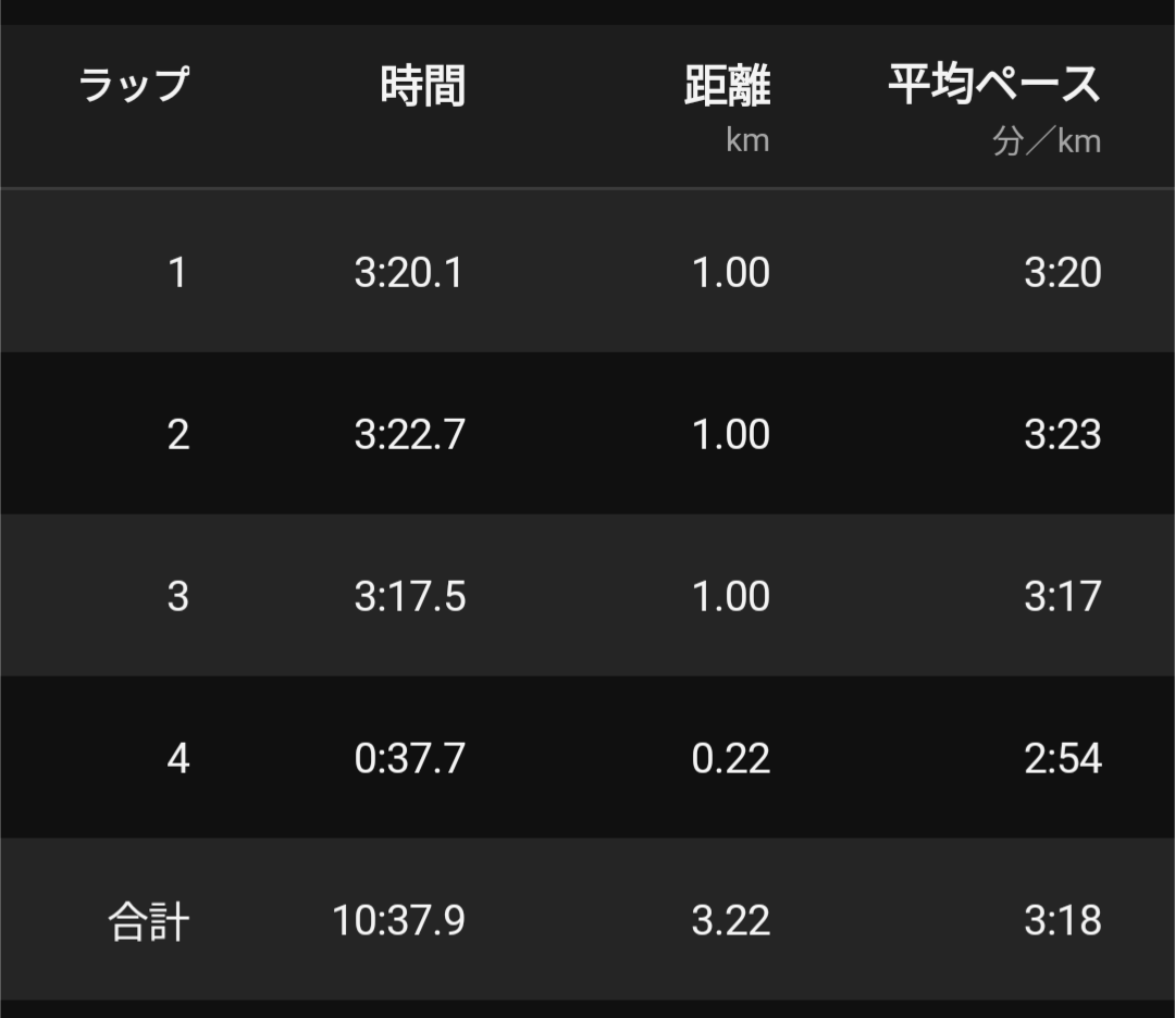 突っ込んだら即死だと思ったので抑えめに抑えめに。1〜2kmも3’20で耐えられたらなお良かったけどチョイ落ちの3’22ならまあヨシ。