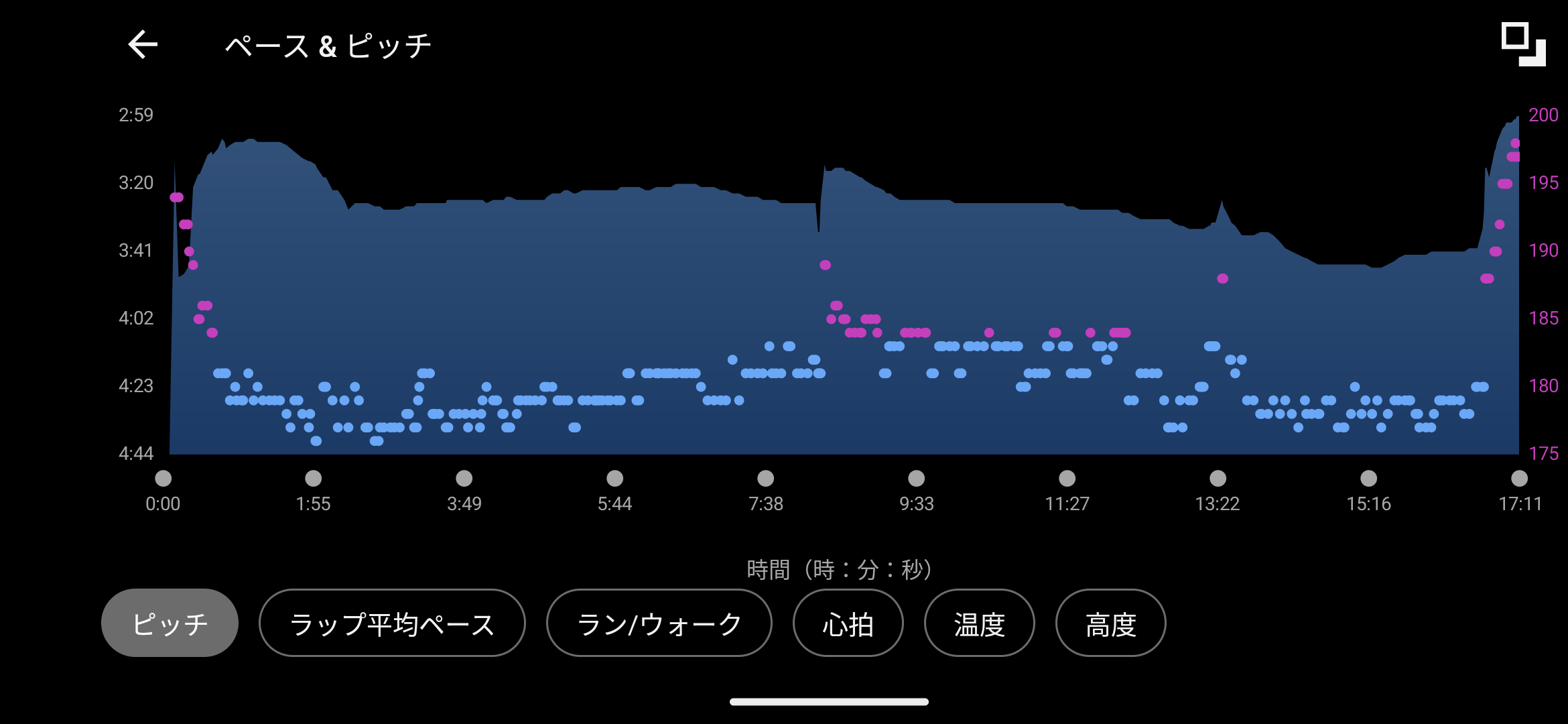 そんなことを考えつつ。一方でここ2~3週間は練習結果も良いとは言えない内容なので、17分はかからんよなーと思いながらもなんとなくの不安アリ、みたいな感じ。