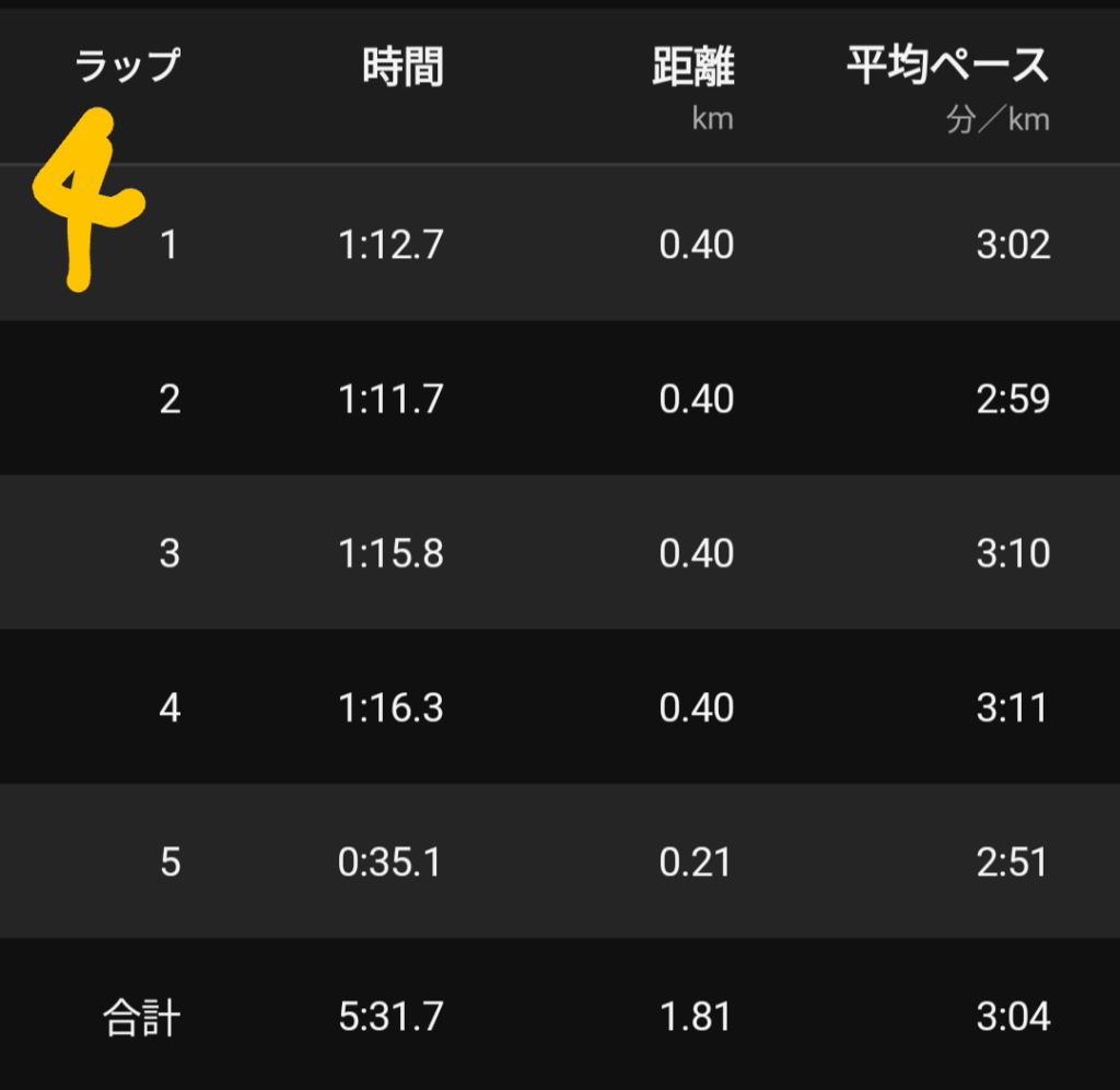 個人の走りとしては1本目をやや抑えすぎた感、3本目の前半が速く入って後半かなり苦しくなったせいで4本目のラストスパートがもはや脚の力が入らずやや不発だった感はあるものの、ギリギリ4本目を最速タイムにできて良かった。