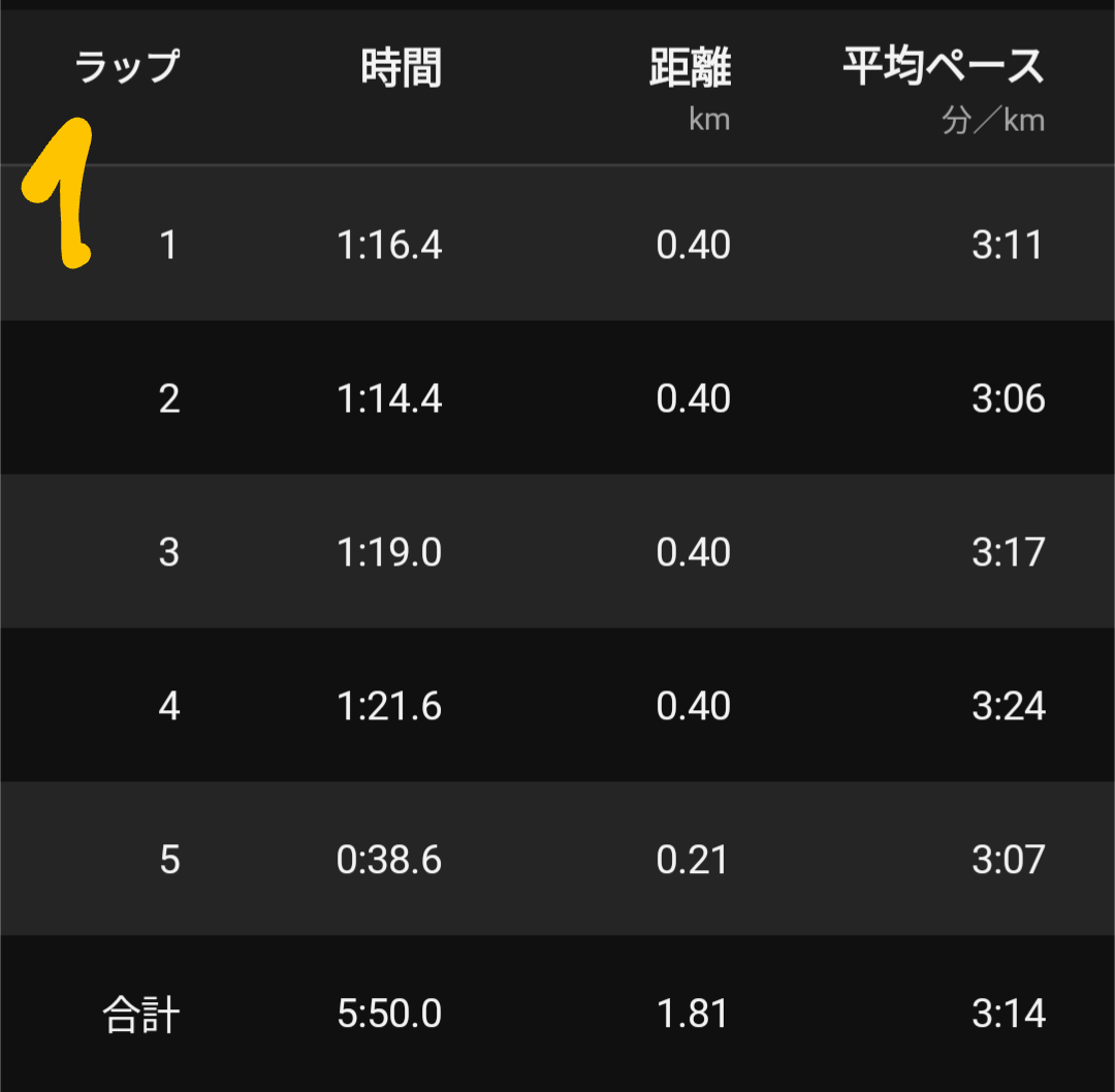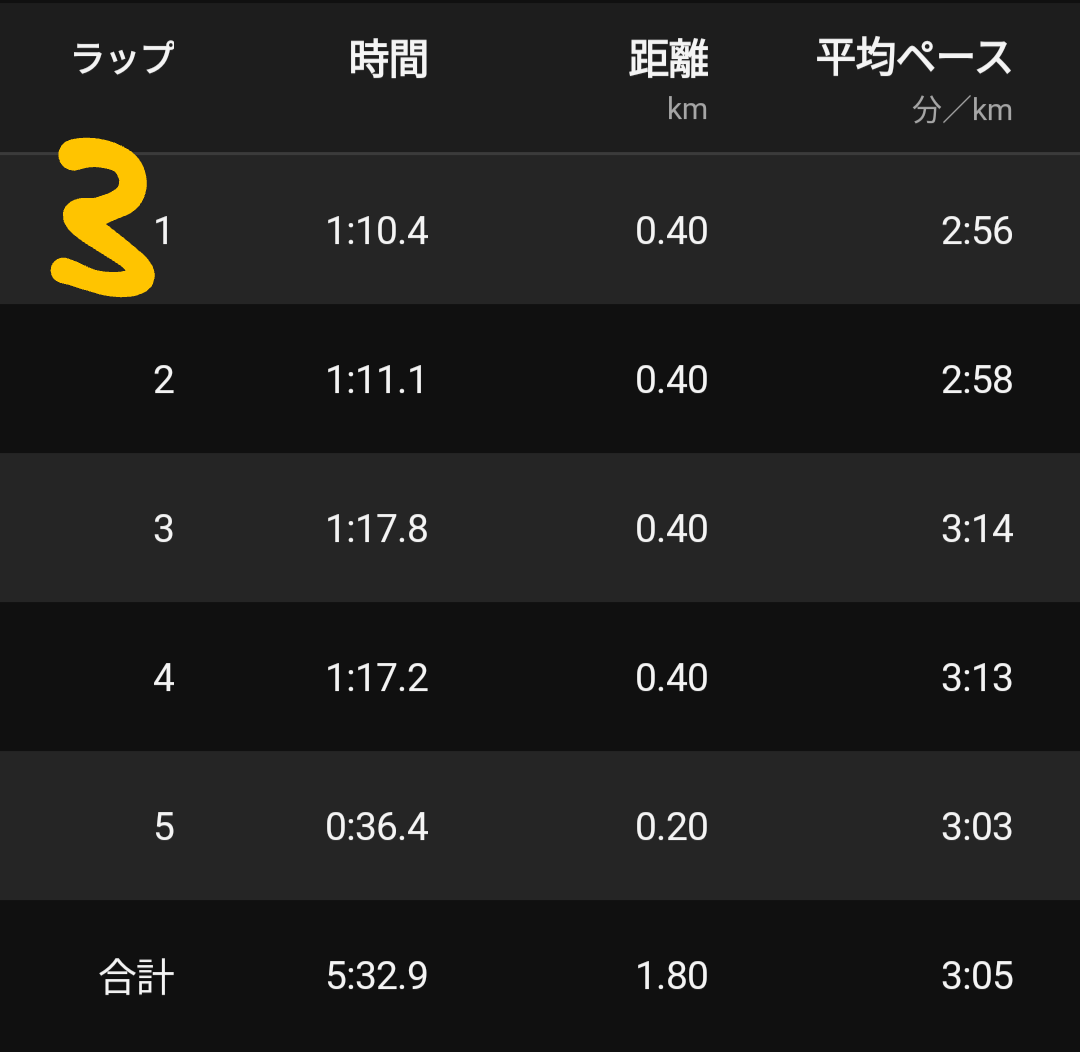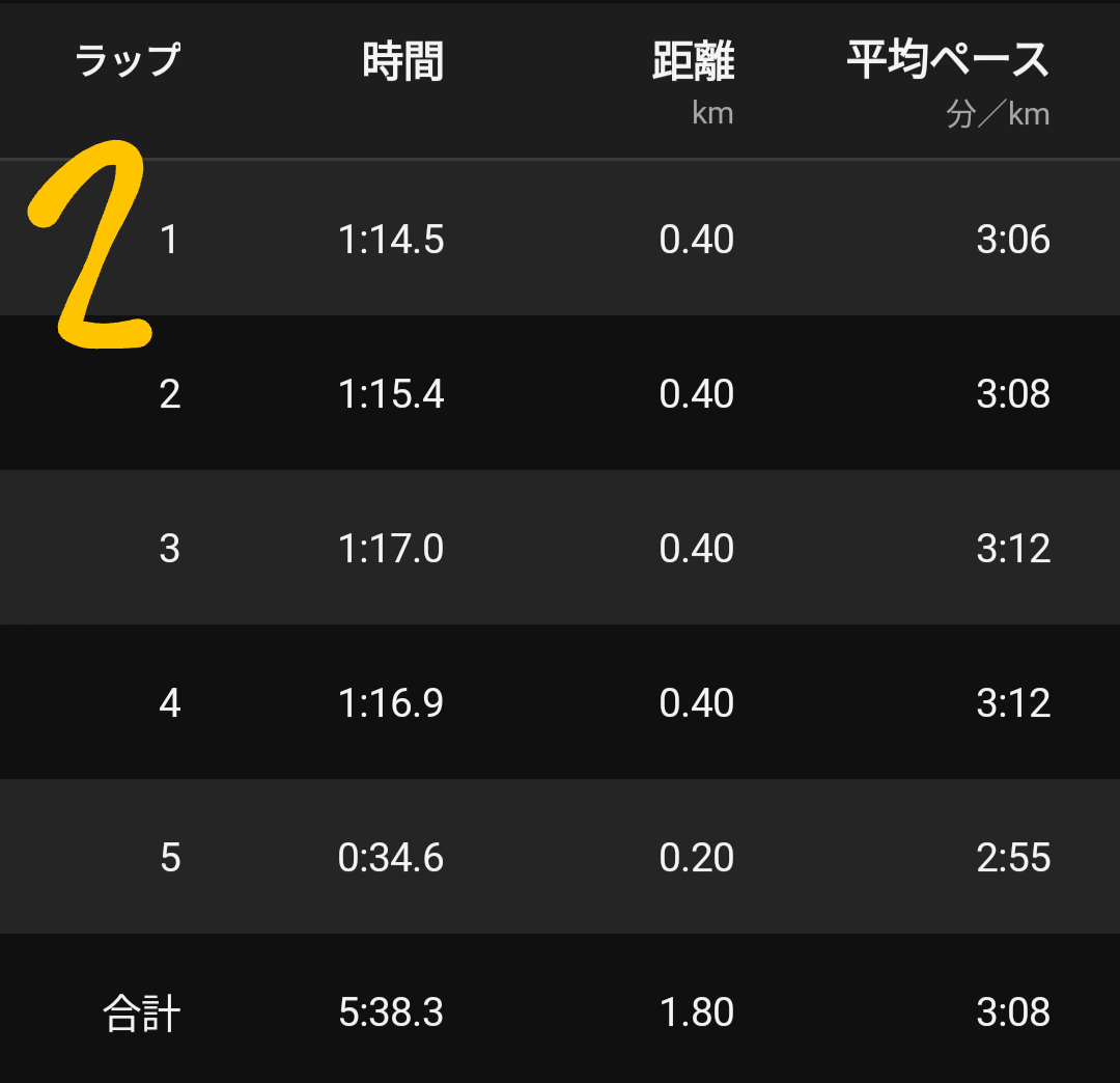 個人の走りとしては1本目をやや抑えすぎた感、3本目の前半が速く入って後半かなり苦しくなったせいで4本目のラストスパートがもはや脚の力が入らずやや不発だった感はあるものの、ギリギリ4本目を最速タイムにできて良かった。