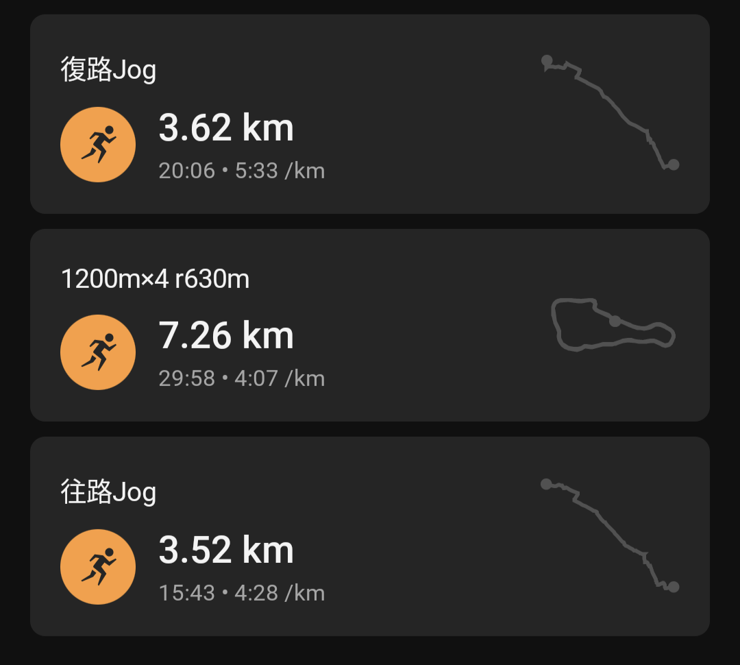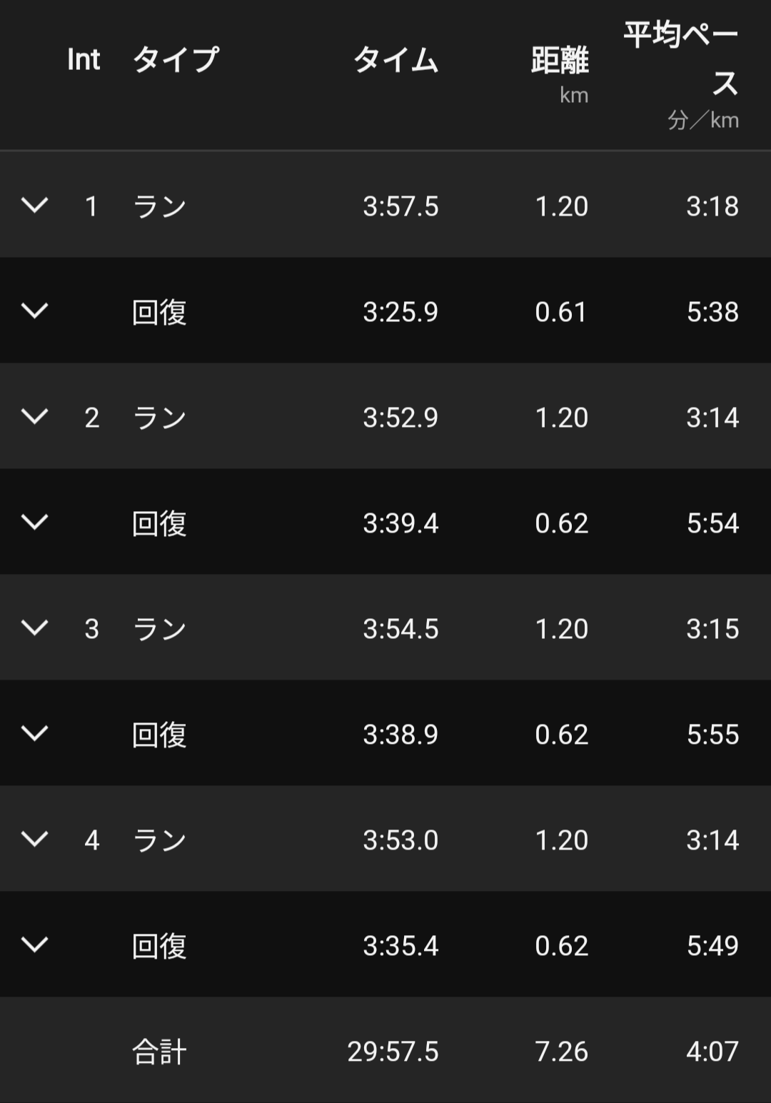 3本目終了時点でだいぶキツくて、つなぎのJogをスタートするのに苦労した。後半もちなおしてスピードアップしたけど3’30に間に合わず。