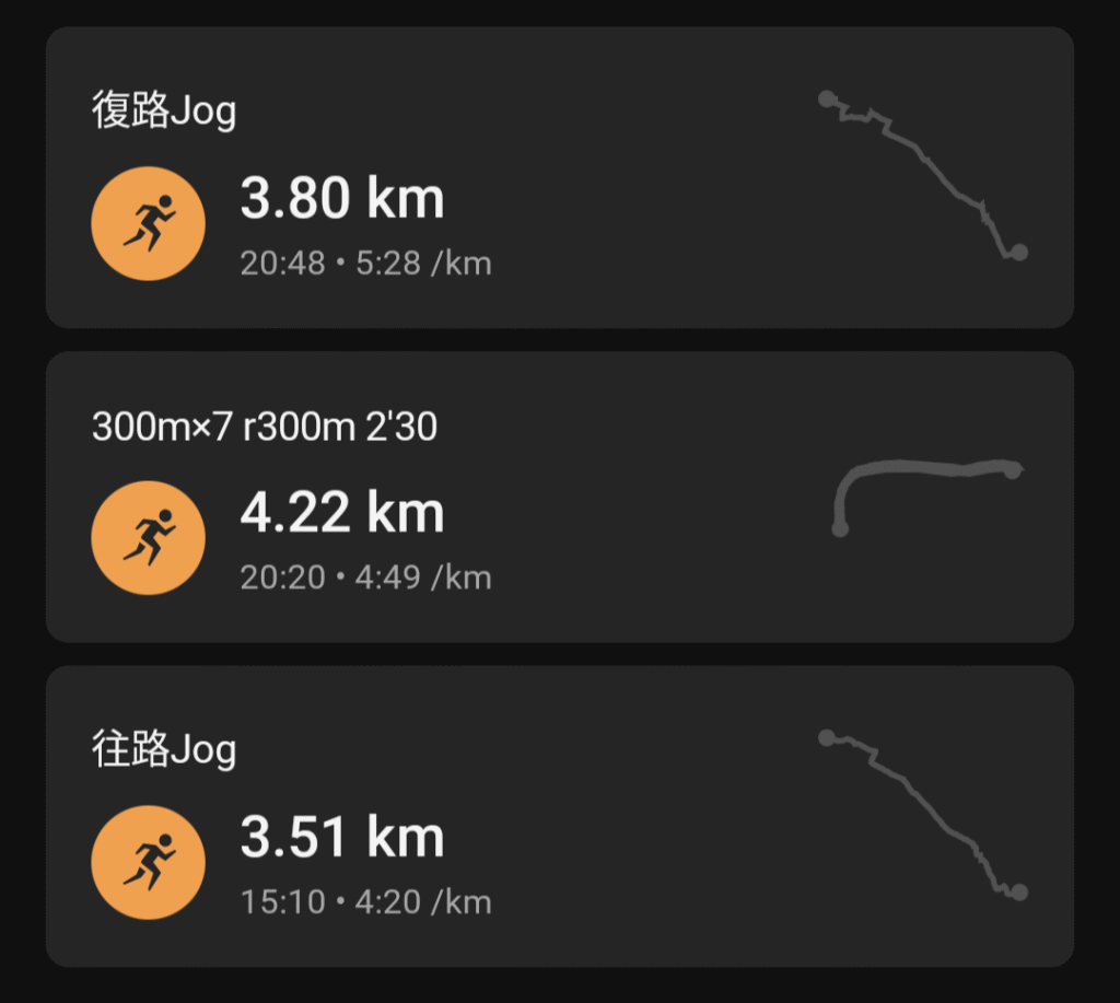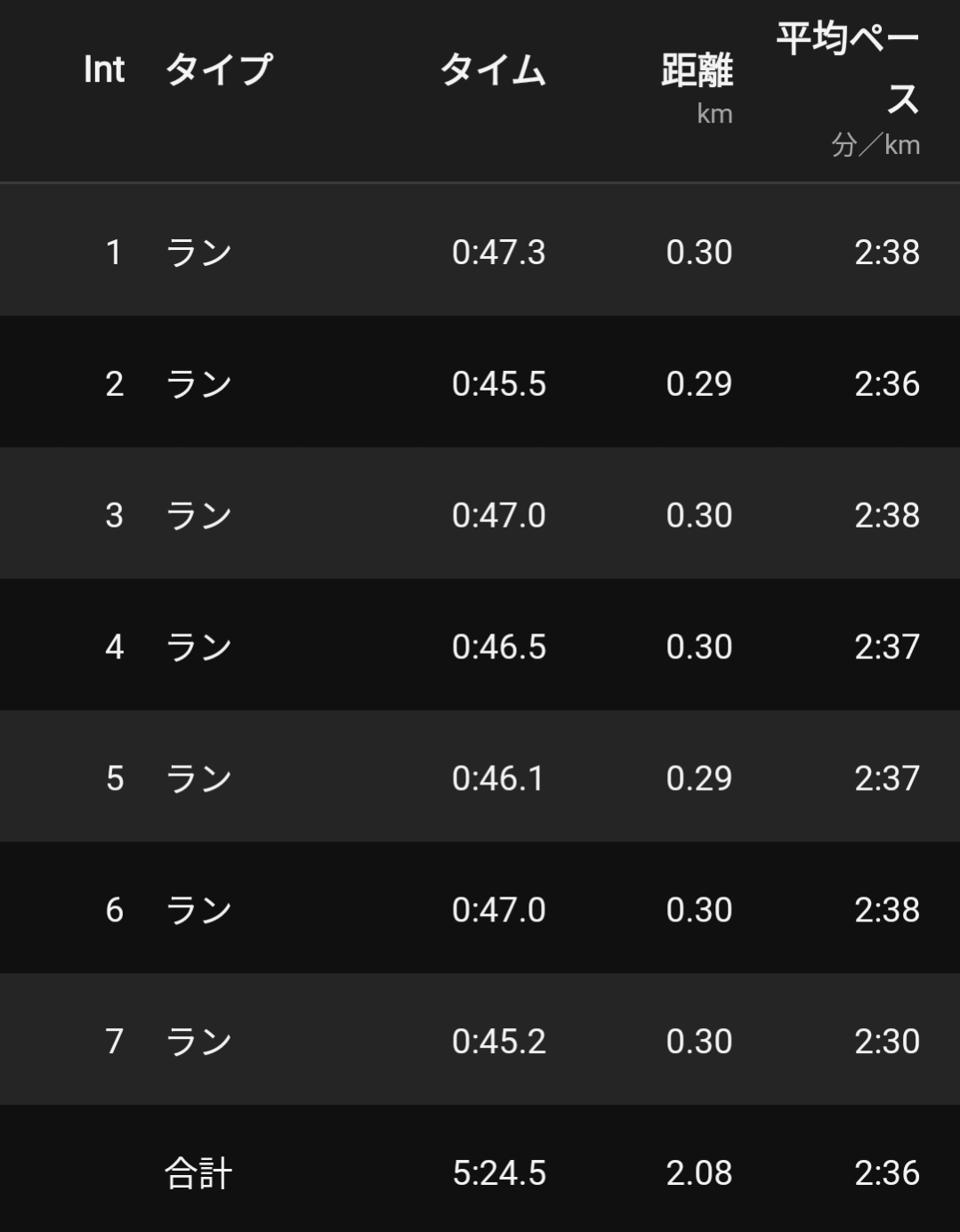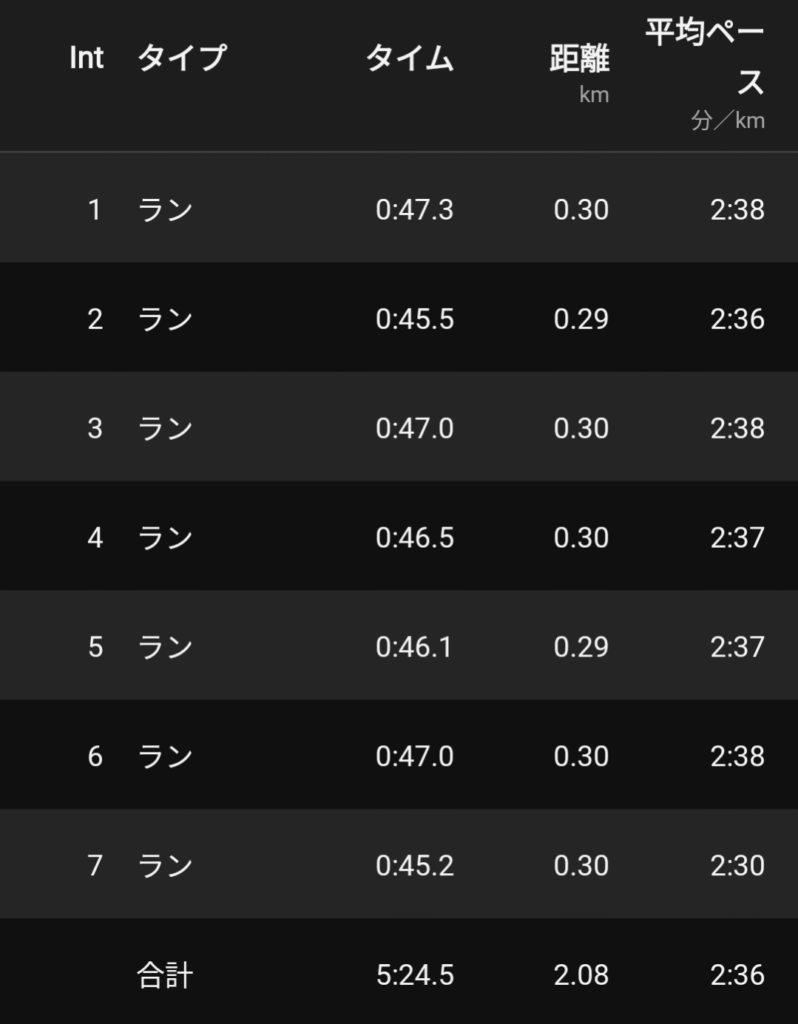 北風2mってなってるけどほんとかいな。体感としては無風に近かったので、東風の追い風基調だと思う。コンディションはかなり良かったので、飛ばしすぎないように最後の1本までしっかりこなすことを意識。