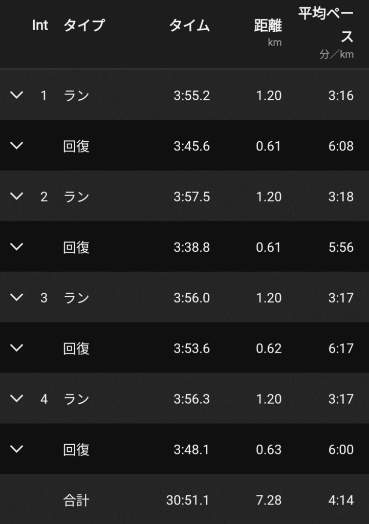 さて前回が6日前だけど、アベレージ3秒落ちだけでなくリカバリーも前回が3’30以内だったのが今回は3本目から若干歩きが入ってしまったのでパフォーマンスとしては前回からだいぶ落としている。