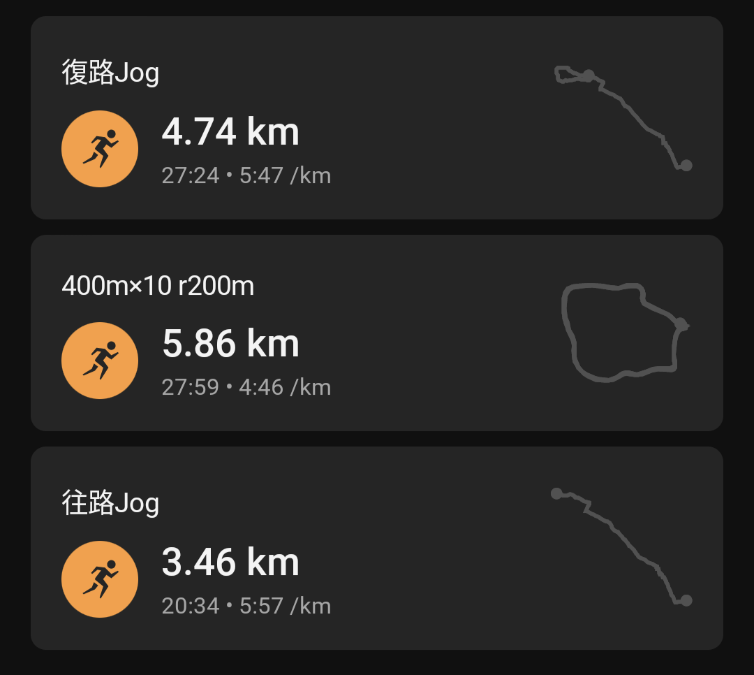 9/9~9/18の10日間のうち、発熱が3~4日であとは咳みたいな感じで休んでいたわけだが、9/19に走るのを再開して今日でまた10日。安全運転で10本と思ってたけど、80秒切るぐらいのスピードが想定以上にキツくて無理だった。