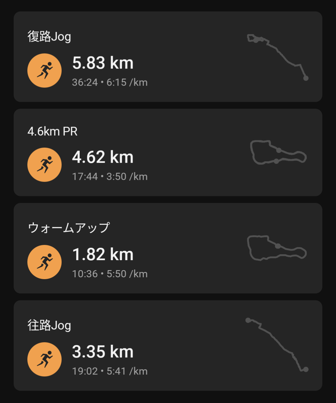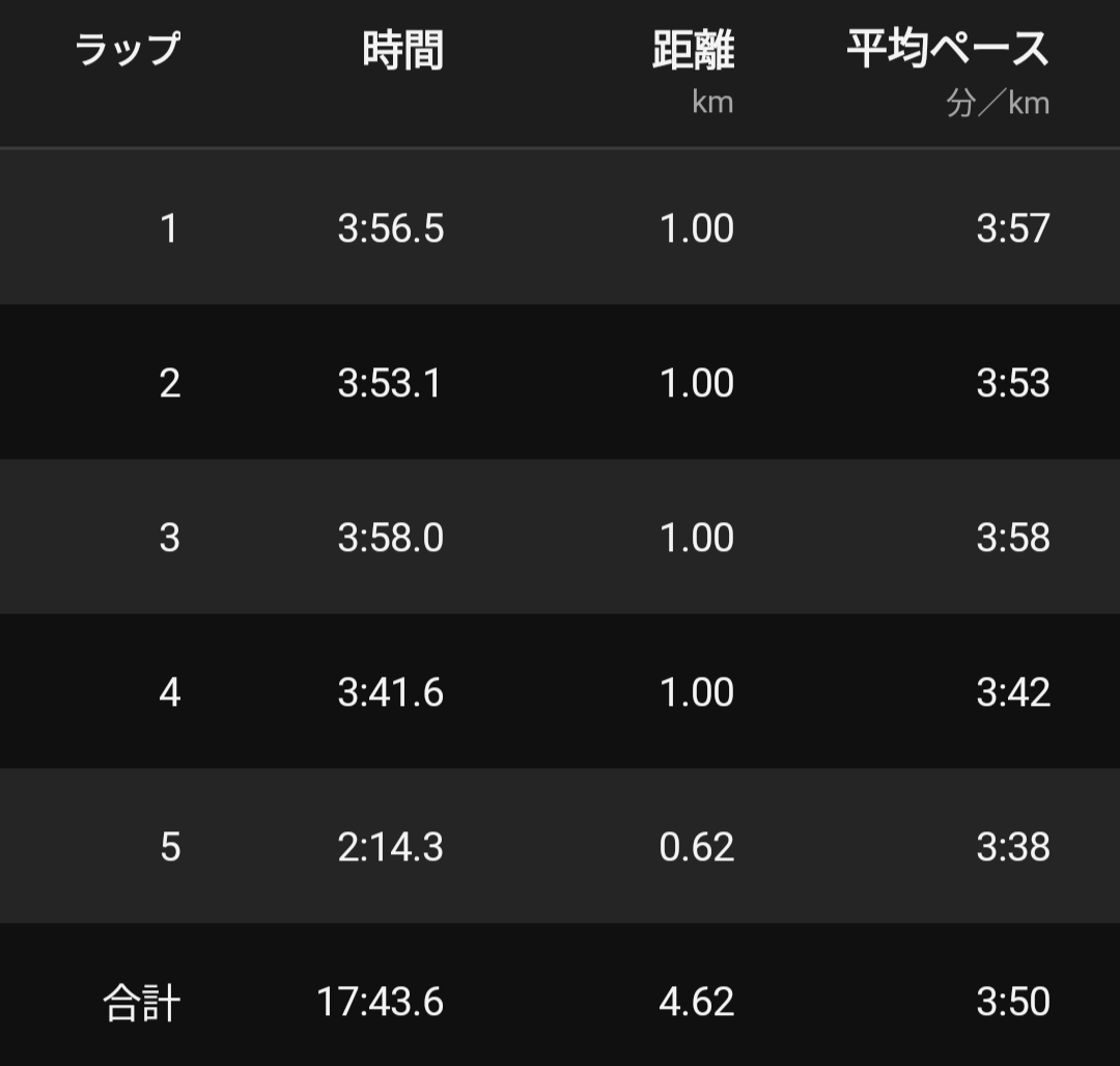 結果3’50/kmでいけたけど、落としたつもりがないのに途中3’58、そのあと3’41でもう俺限界www